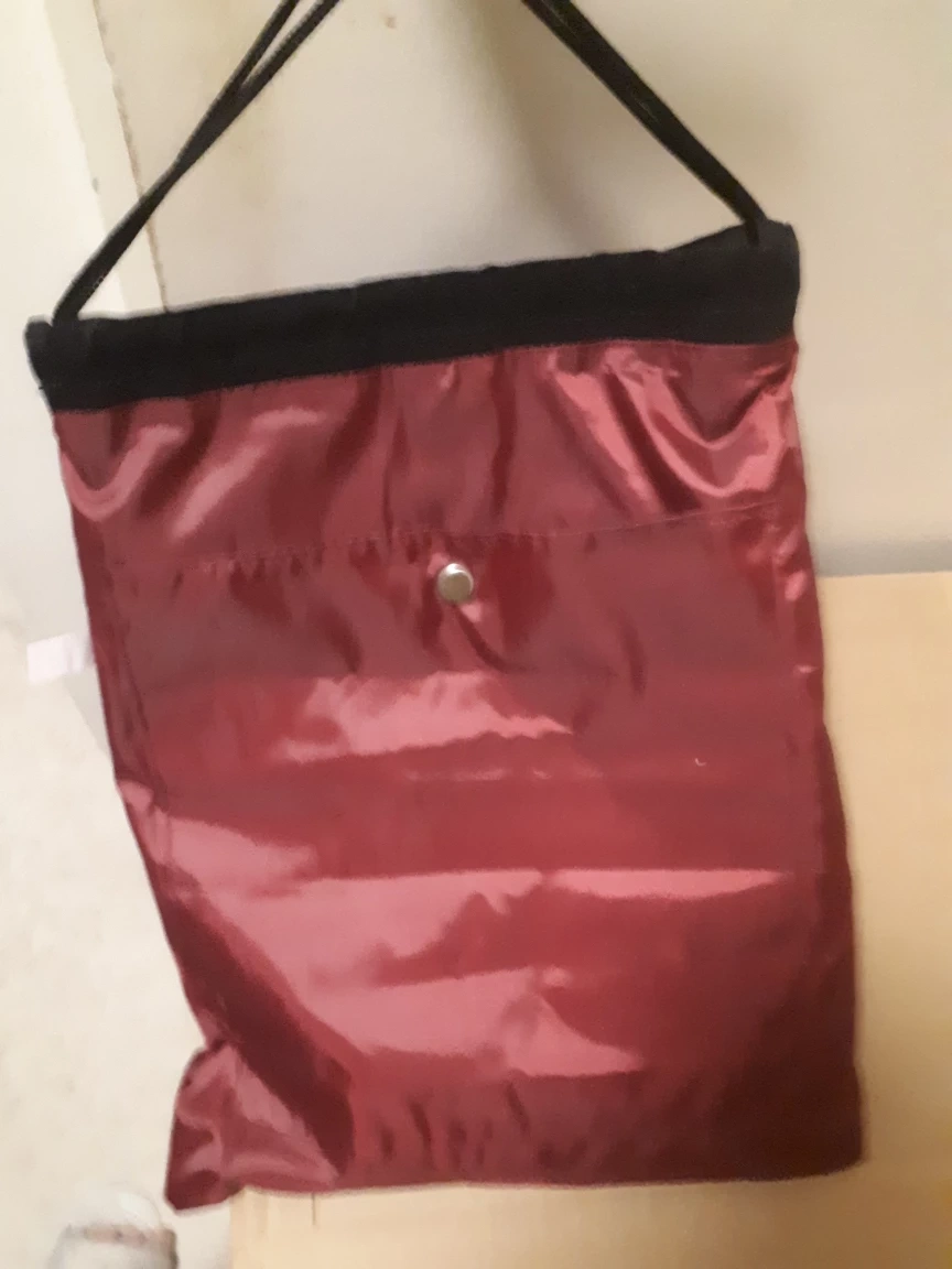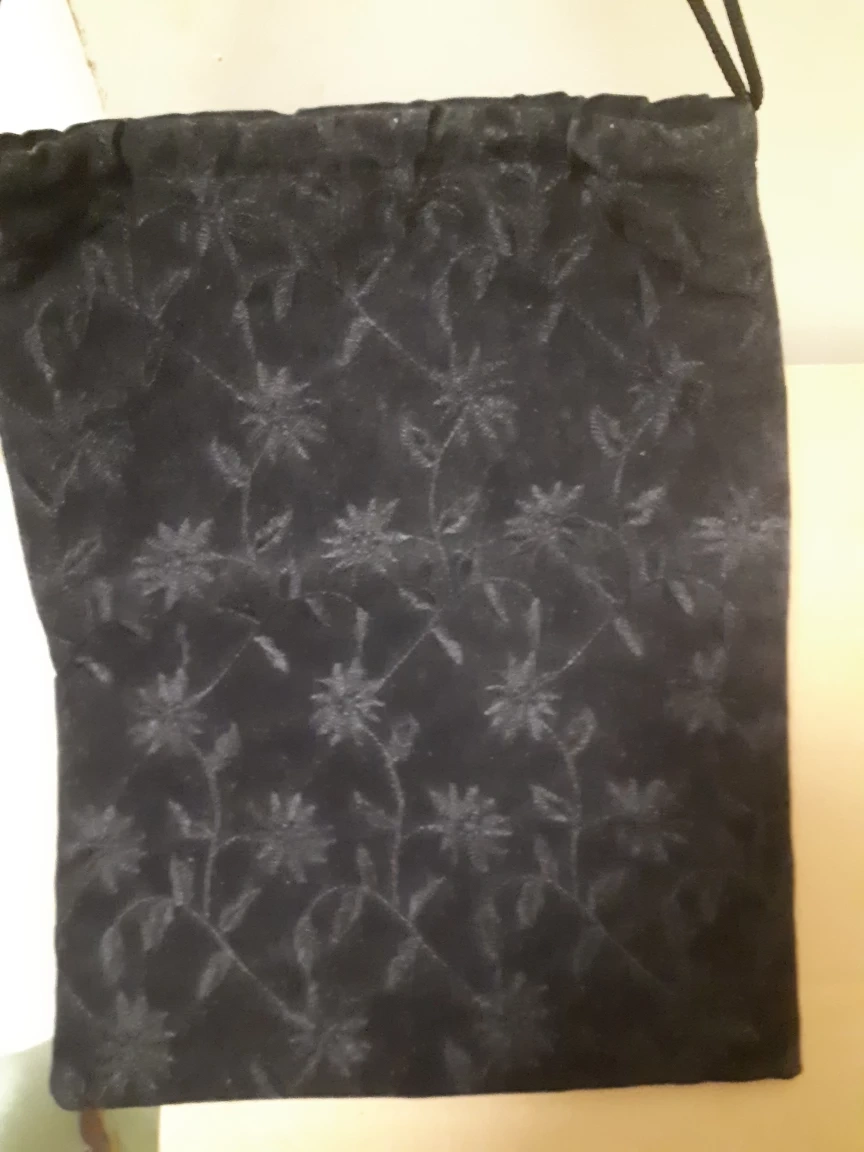 Black Drawstring shoe bag with fuschia lining and a floral design on the back. Has a small snap button closure.