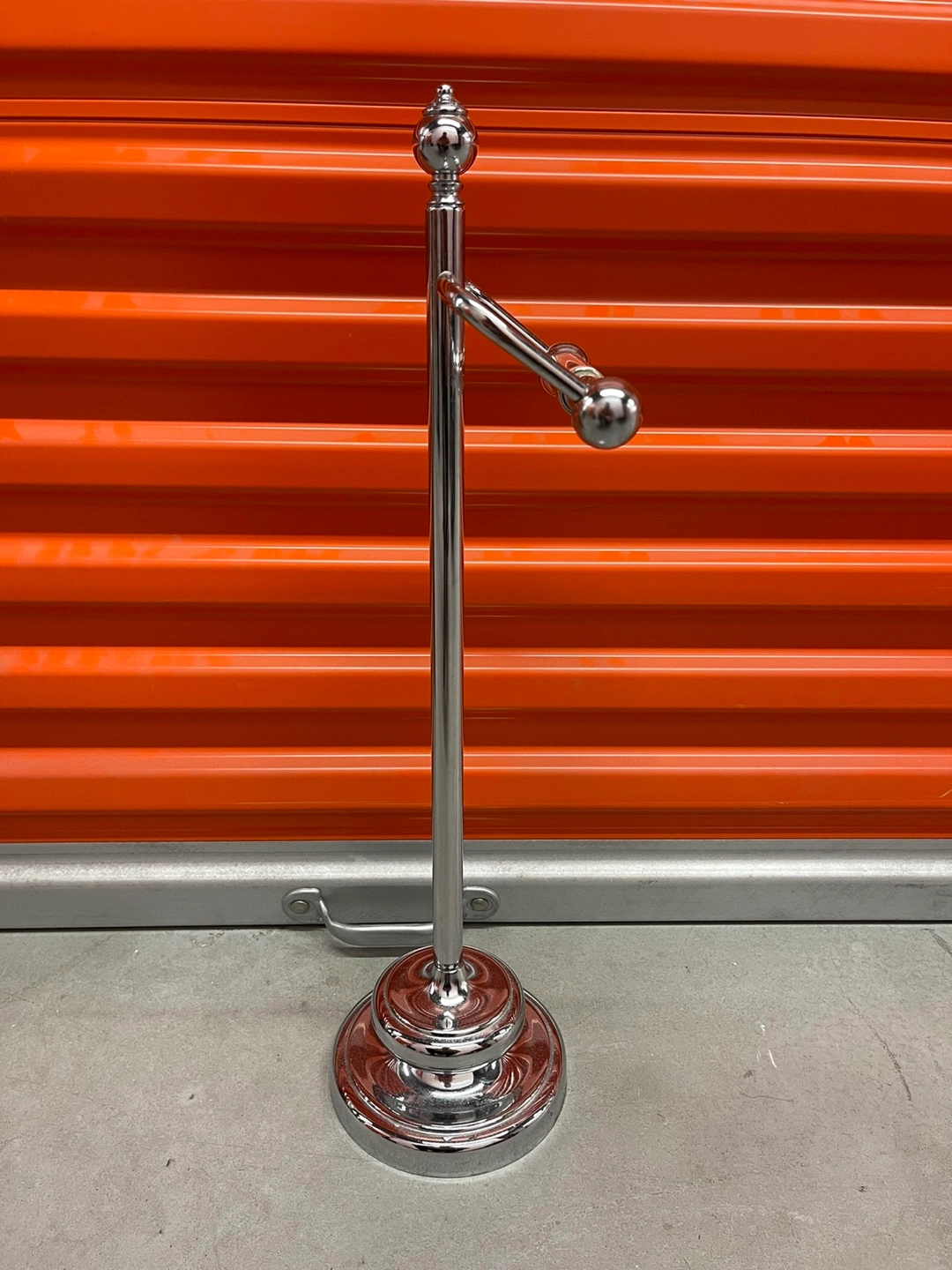 Free-standing toilet paper holder with a chrome finish. Holds two rolls of toilet paper.