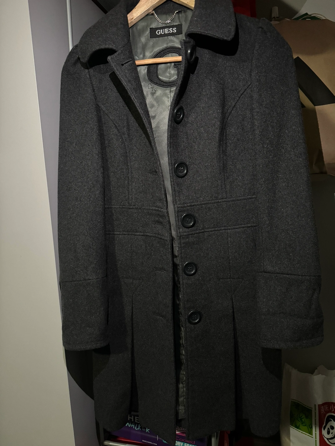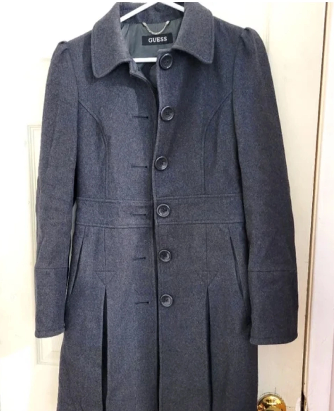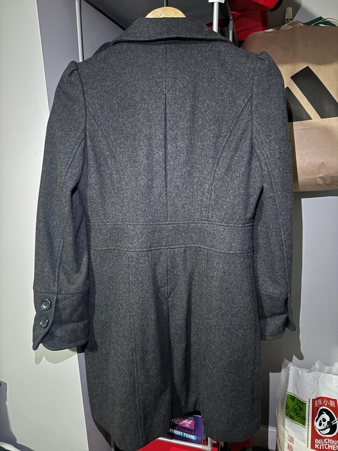 Grey wool blend winter coat with black buttons. Has a collared neckline and long sleeves. The coat is lined. Size XS