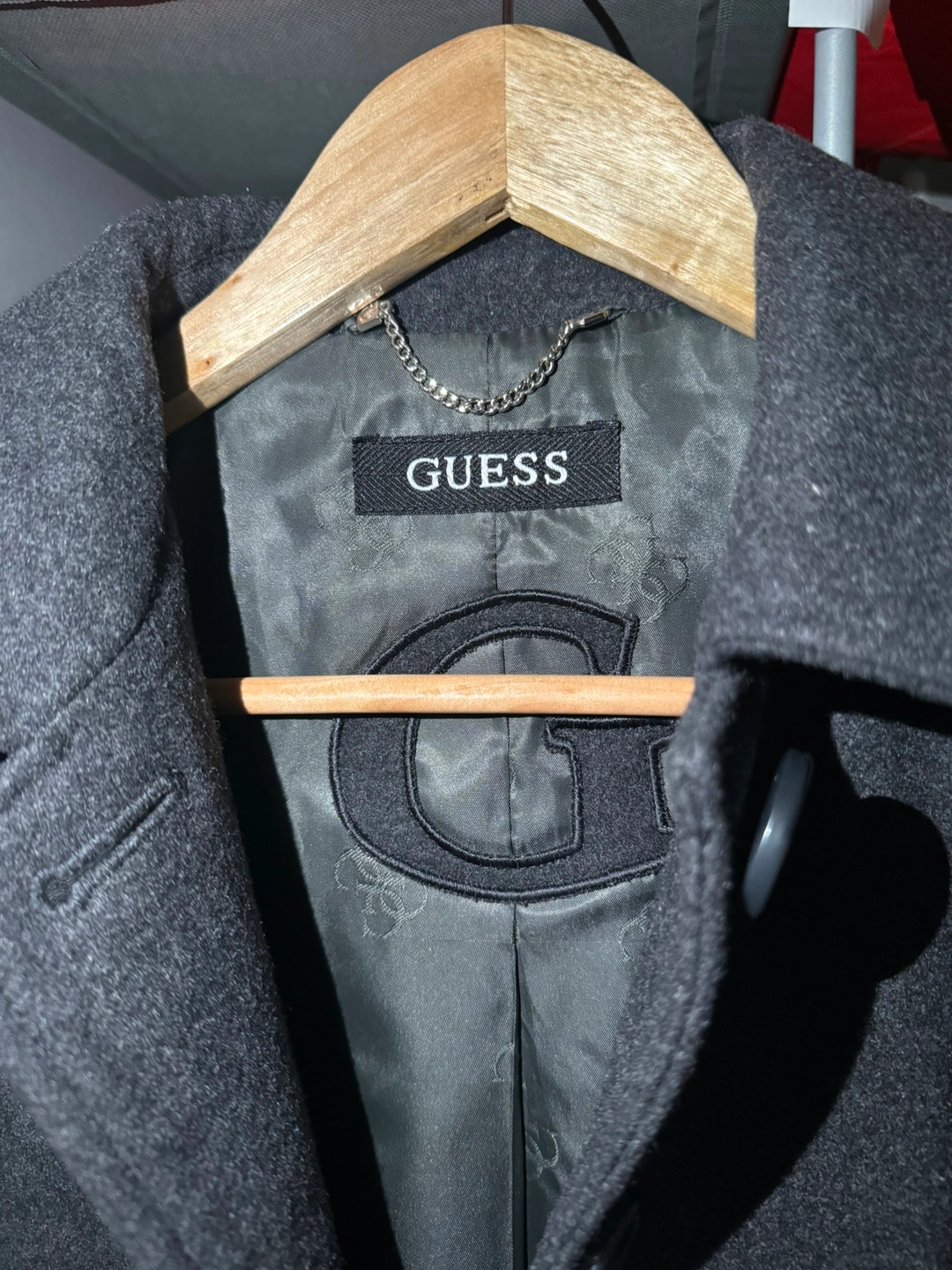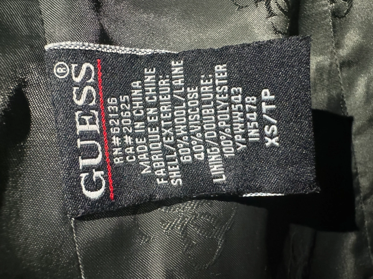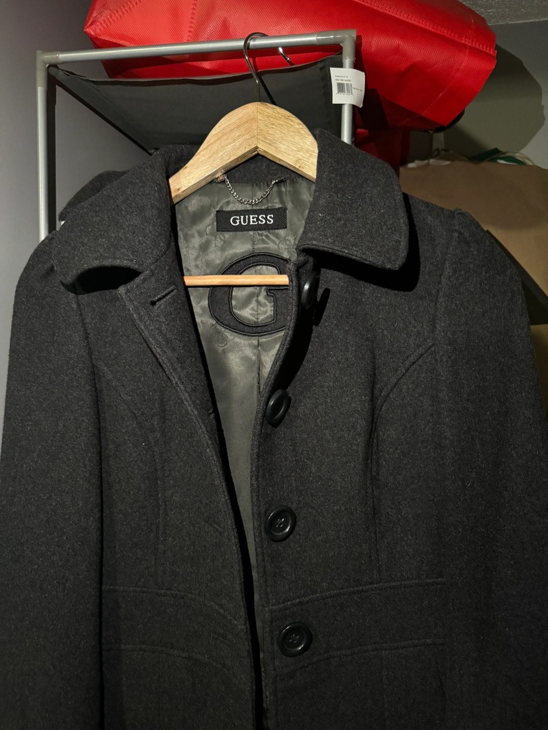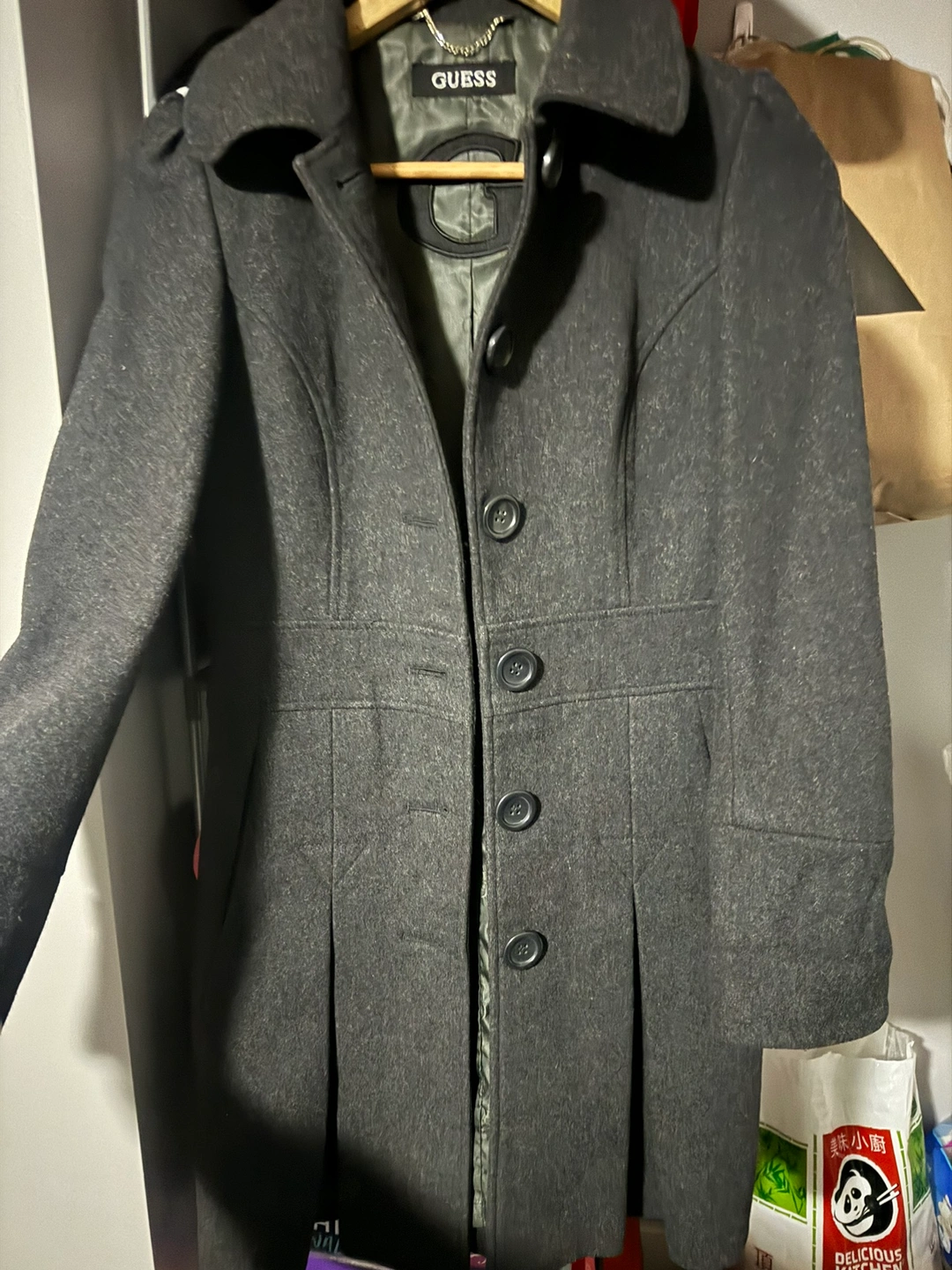 Grey wool blend winter coat with black buttons. Has a collared neckline and long sleeves. The coat is lined. Size XS