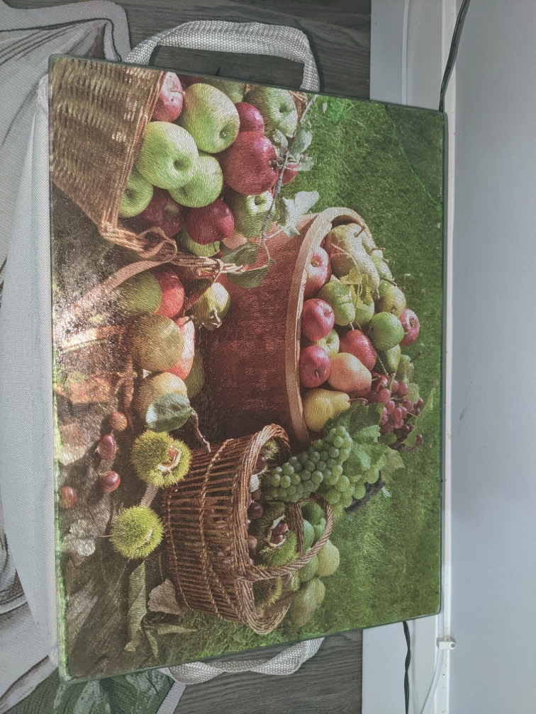 Glass cutting board with a handle. Featuring a design of fruit in baskets. Temperate glass serious Inquiries only no delivery