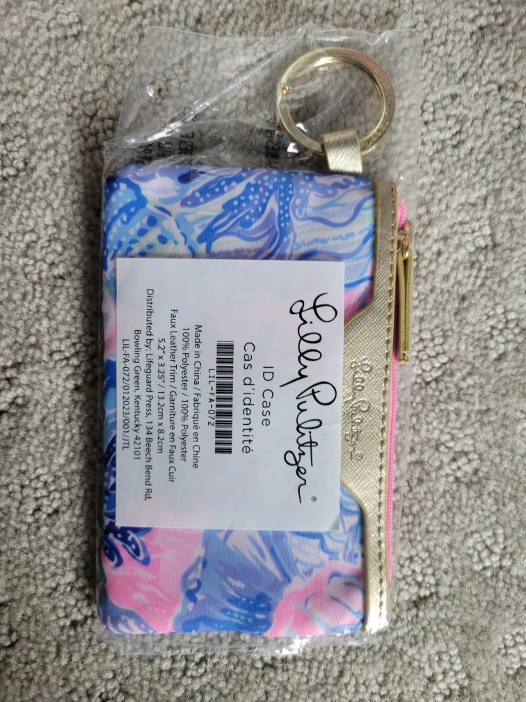 Small zipper pouch with a clear window, keychain loop and blue and pink floral print.