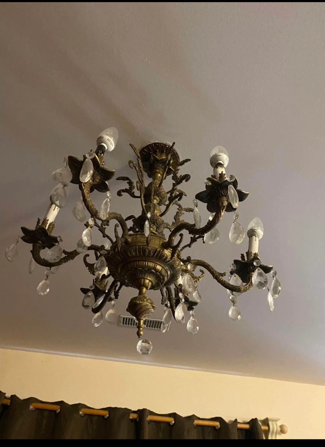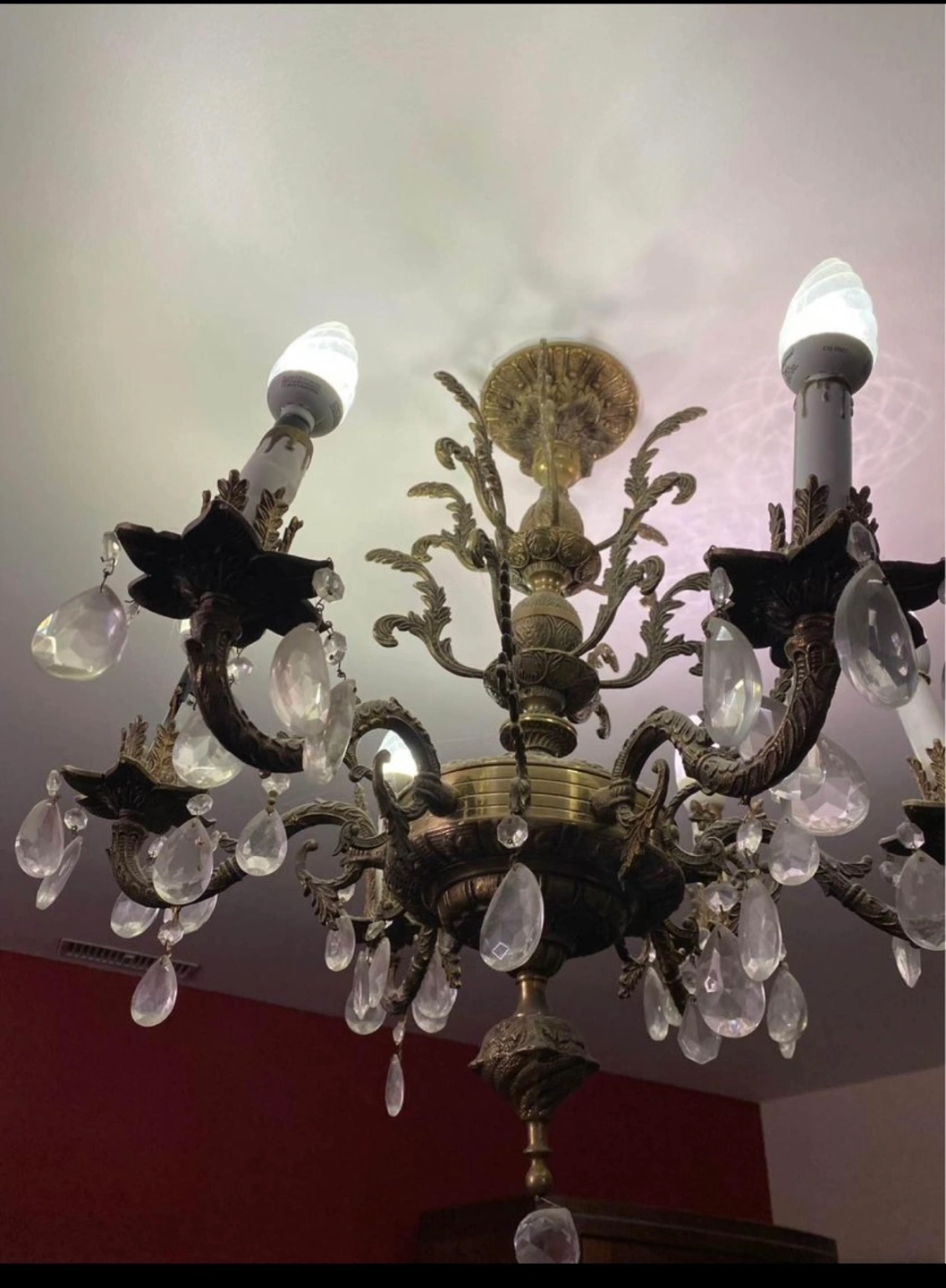 Brass chandelier with crystal accents. In a unique shape of pineapple, comes with 6 LED lights adorned with crystals.