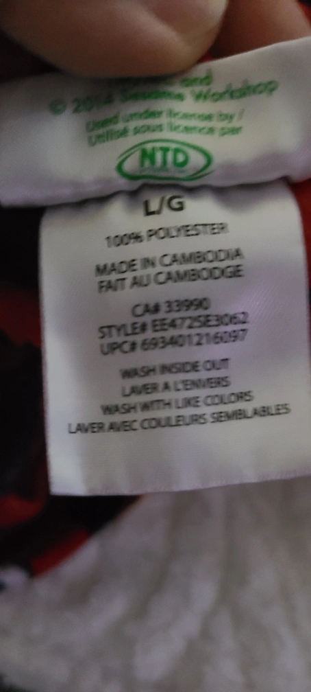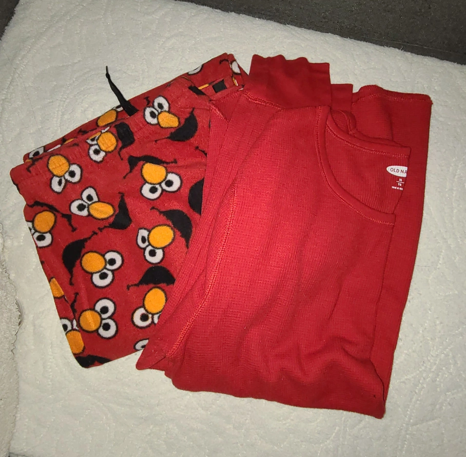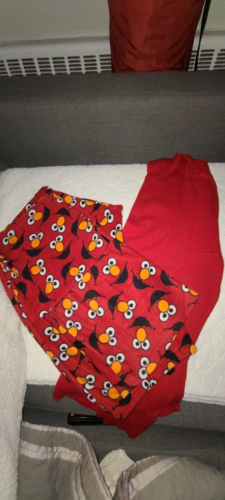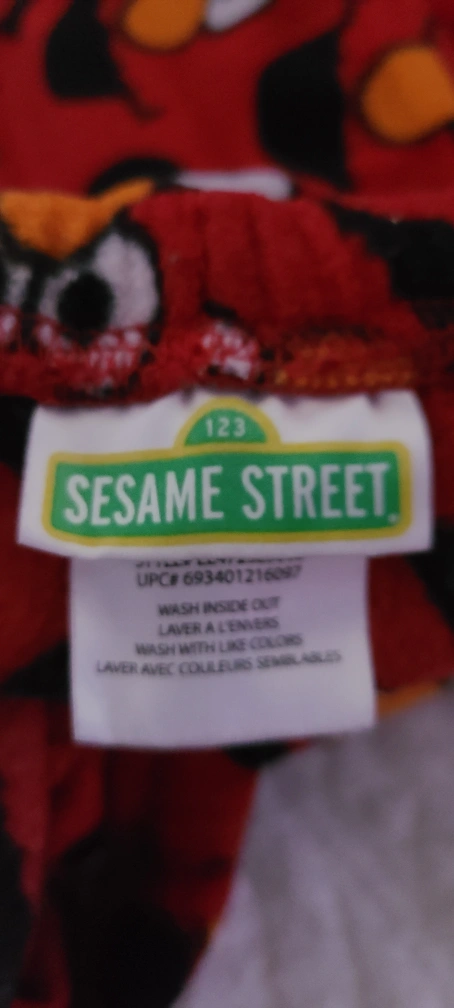 Red long-sleeved top and red pants with Sesame Street character print. Made of 100% polyester.