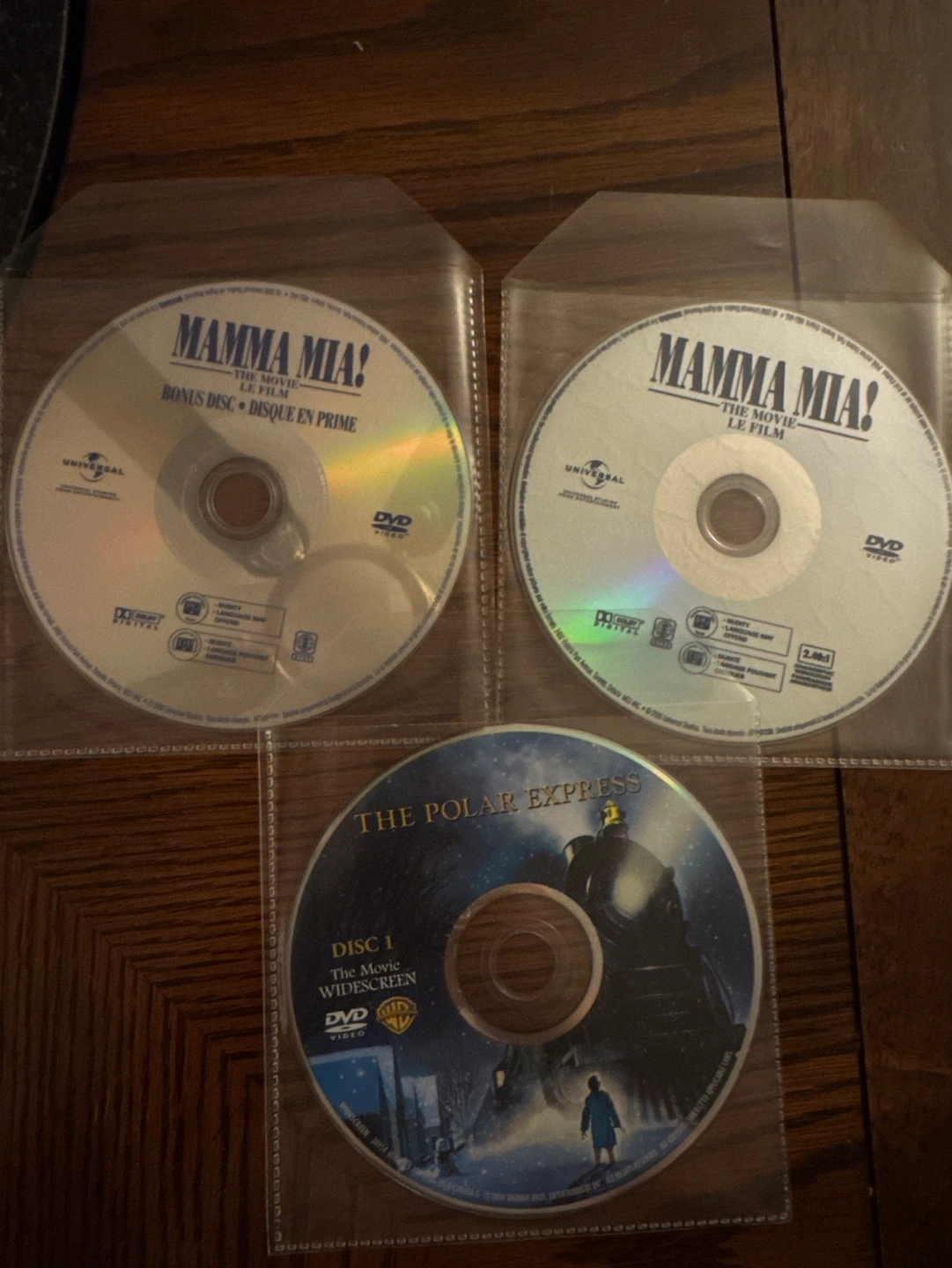 Three DVDs: Mamma Mia! (w/bonus disc), The Polar Express (wide screen version). No original cases