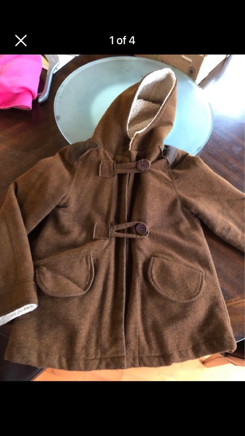 Brown winter coat with a hood. It is lined with a soft fleece material. The coat features a button closure and two pockets.