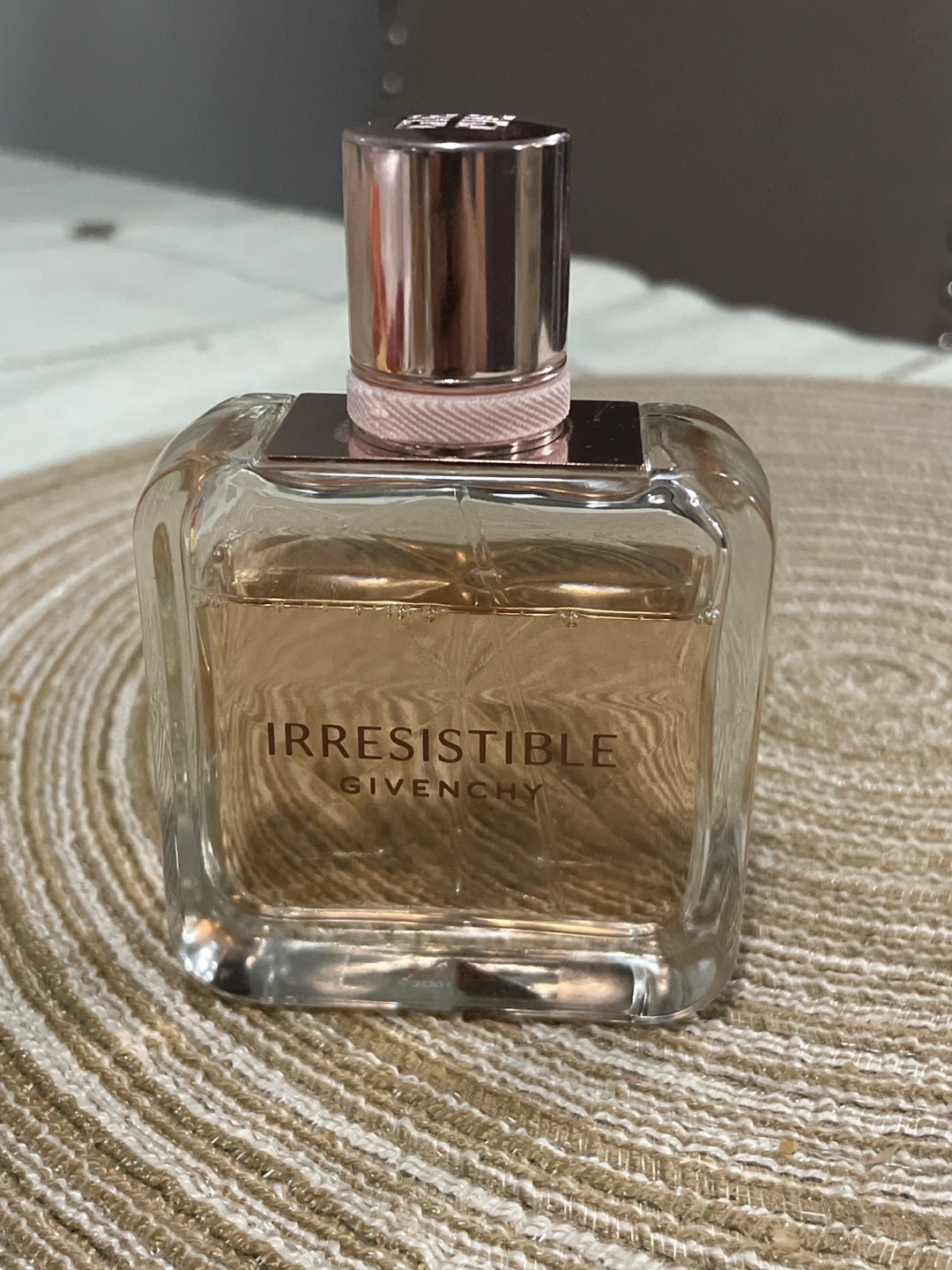 Women's perfume bottle. Comes with a cap and is in the shape of a rectangle. Almost full.