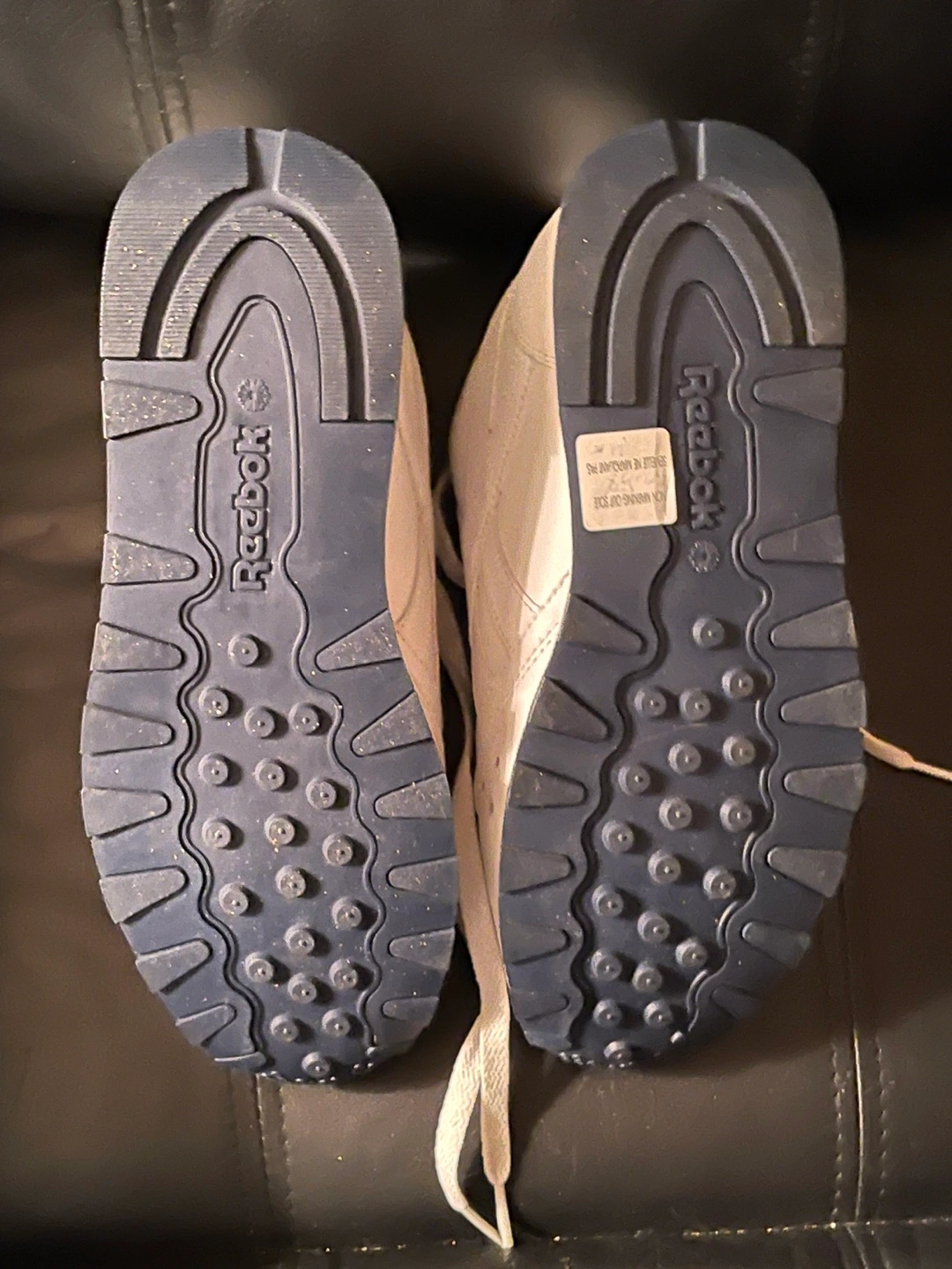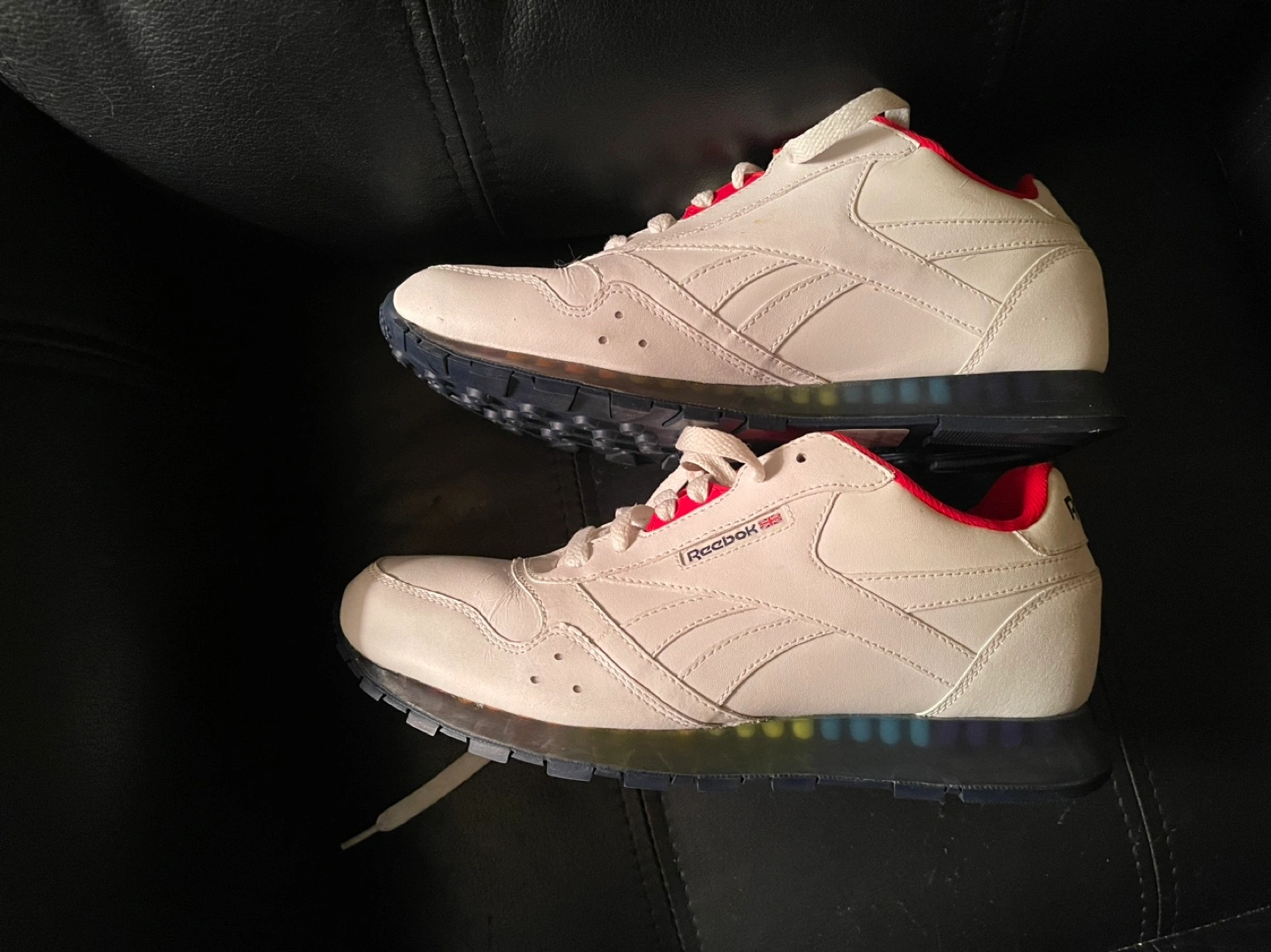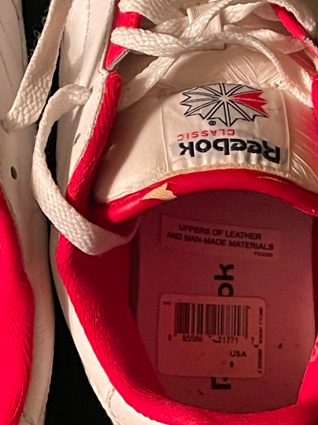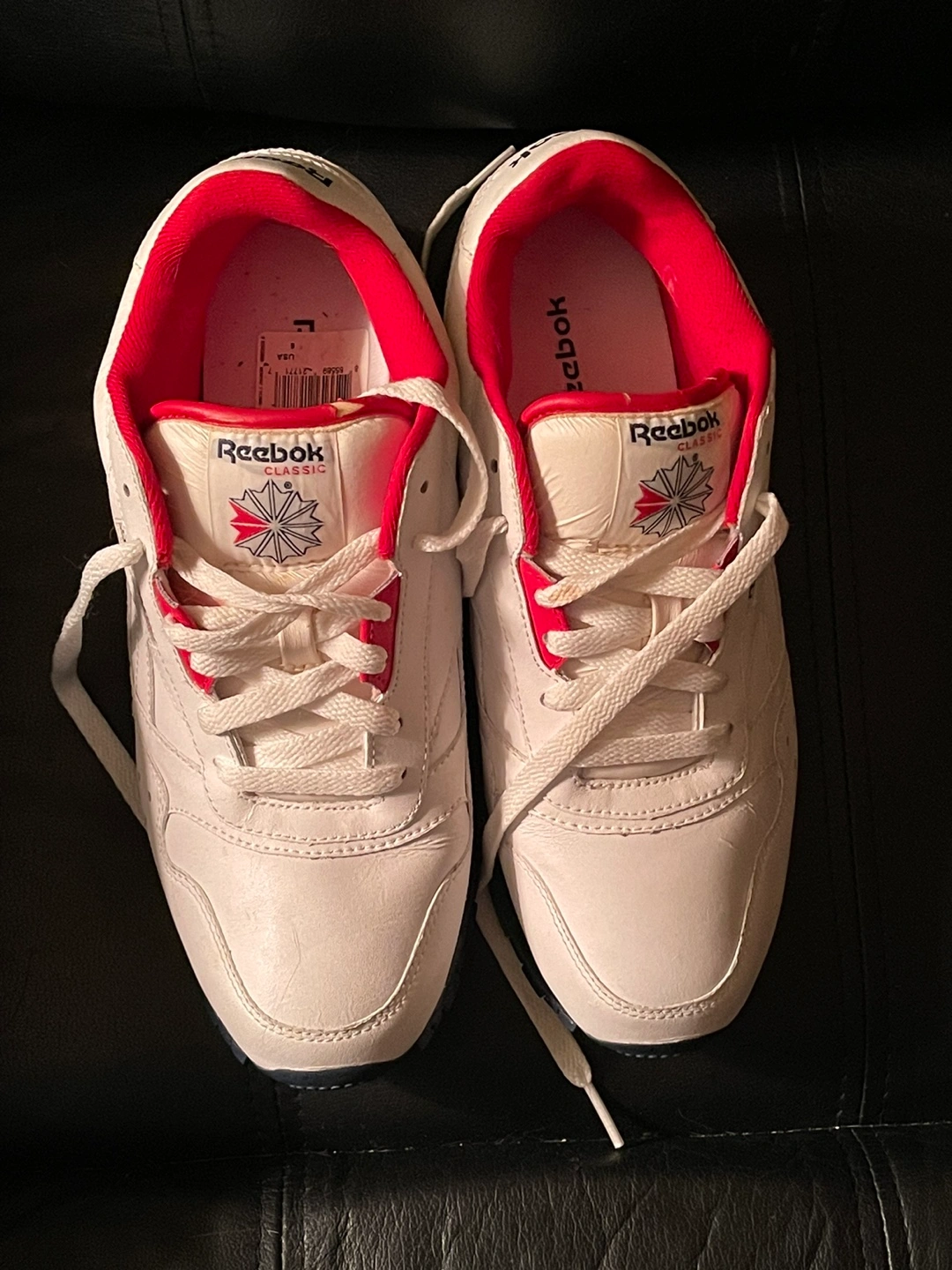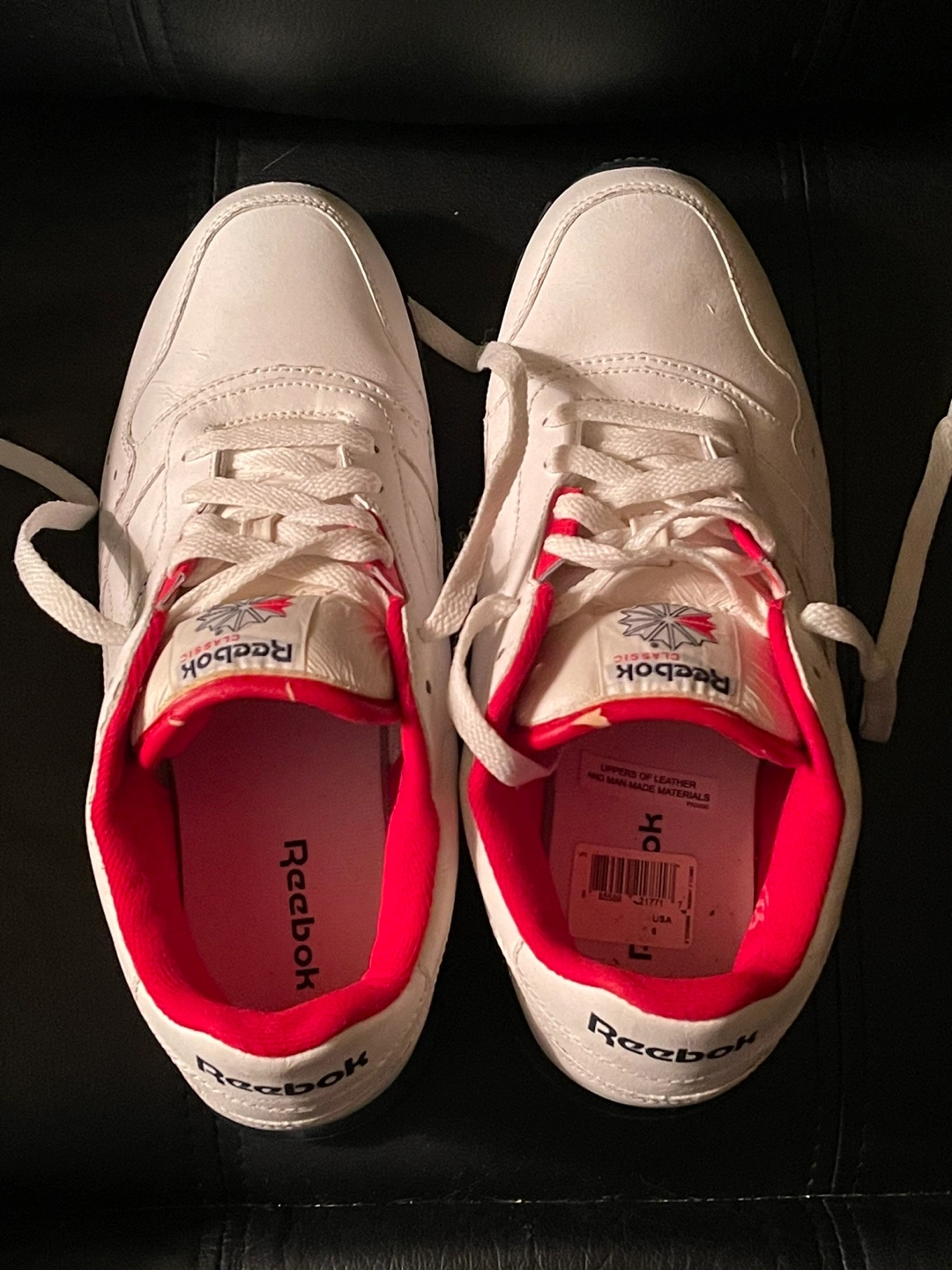 White leather sneakers with red accents. Not sure if these are women's, men's or large kids size. US size 6. European size 38. 24.5 cm. New condition except for some flaking on the tongue trim.