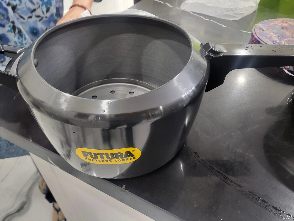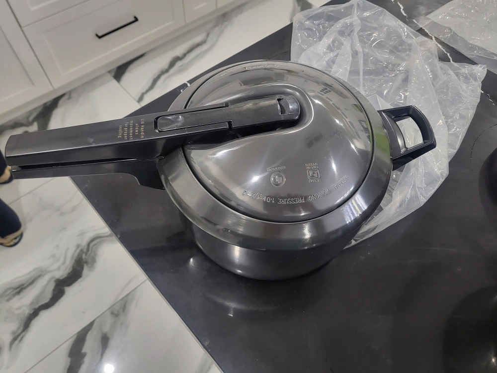 Black pressure cooker with a black handle. Has a removable inner pot. in very good condition.