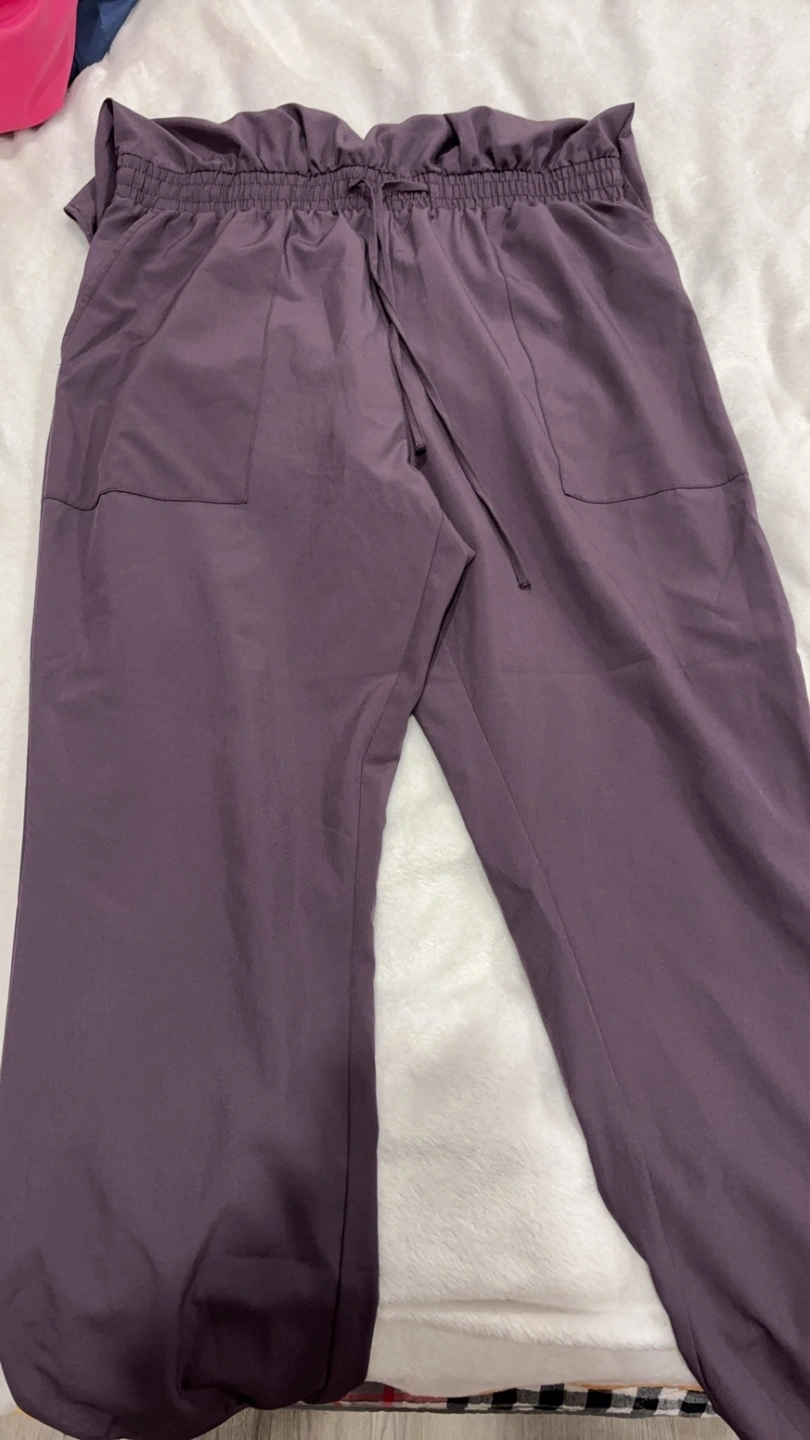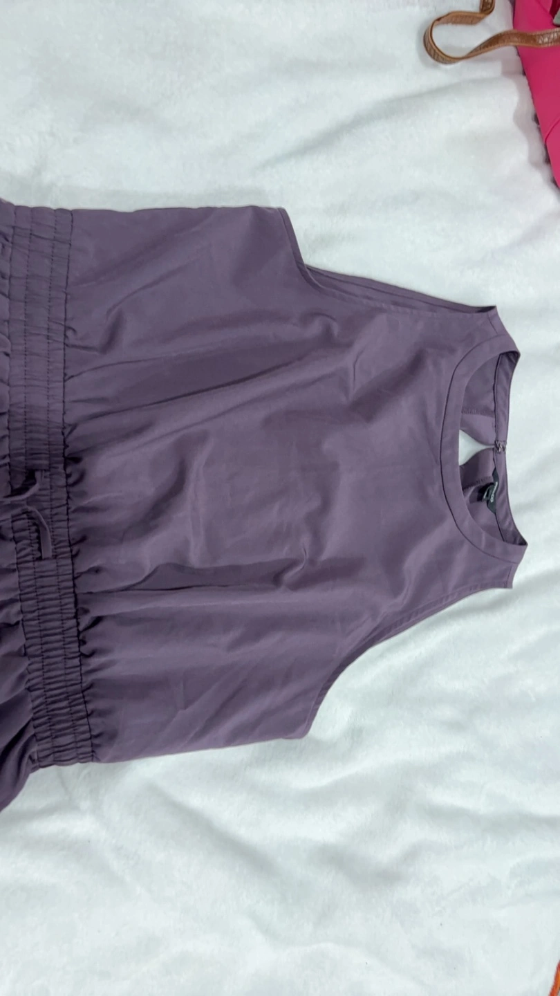 Purple workout jumpsuit with a halter neckline and an elastic waistband. Pockets on the legs.