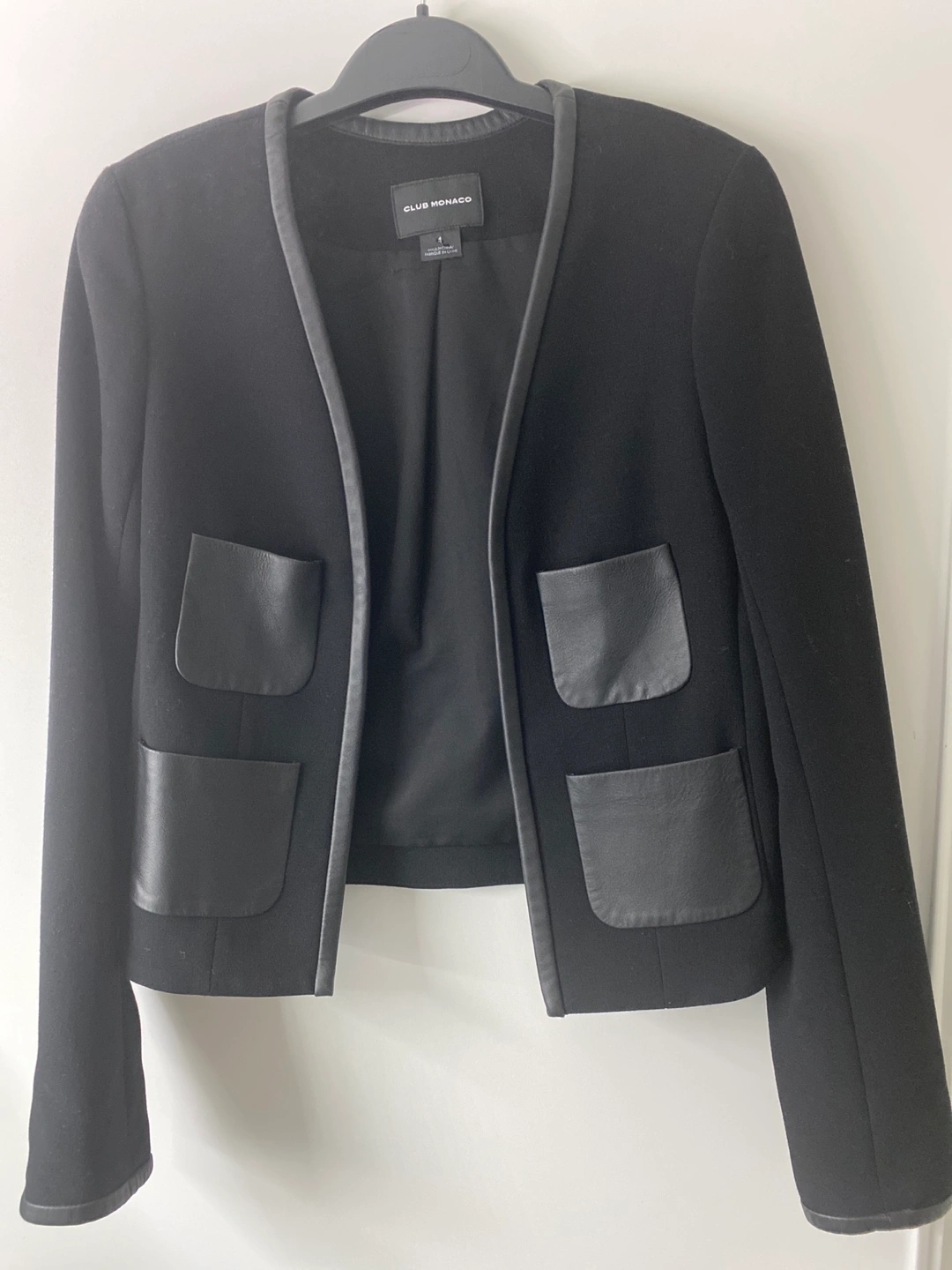 • Club Monaco Black blazer with leather trim on pockets and sleeves. Size 4 • JCREW black pants with leather trim on the side. Size 2 👉🏻Both in very good condition. 👉🏻Take all for $35 ✅ Only available for pick up. ✅ Payment: Cash only ✅ No Smoker & No Pet in the house. ✅NOTE: Please make sure to check the details posted. Like SIZE, brand, make, quality, etc. Can also check the images posted for basis to avoid ordering by mistake. Thanks and have a wonderful shopping ❤️