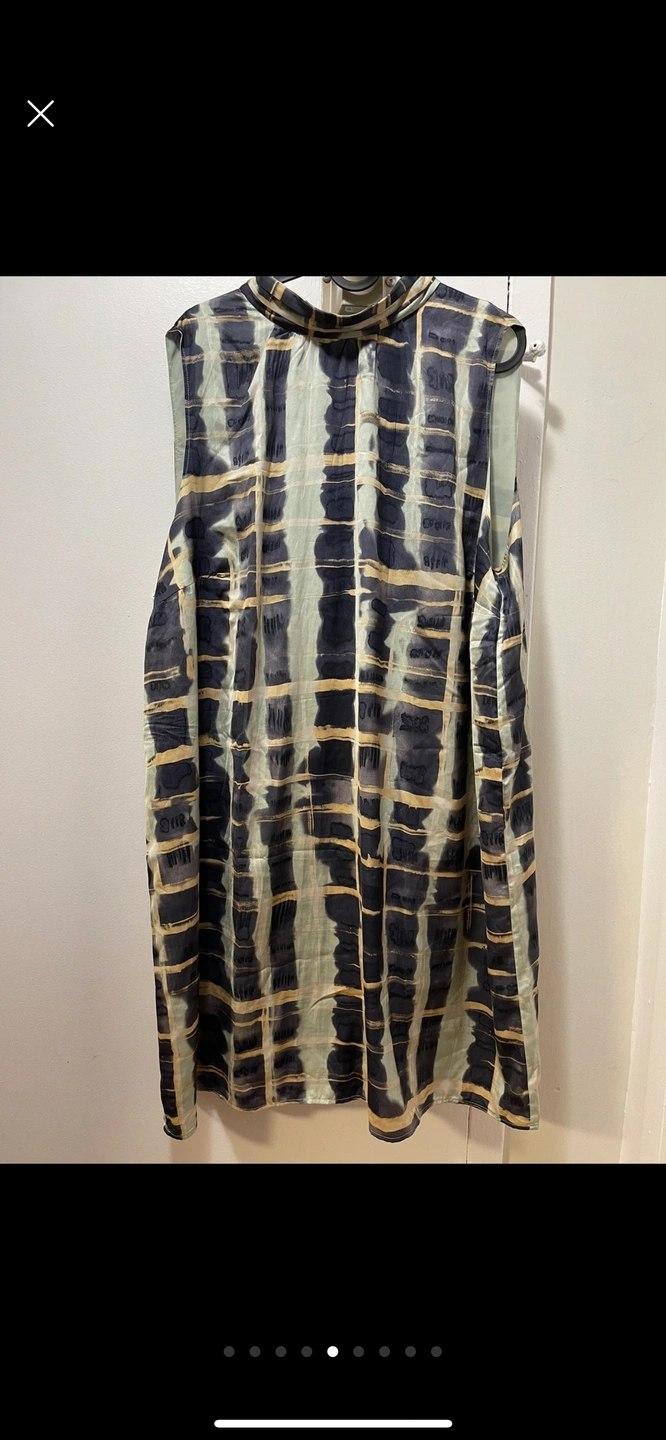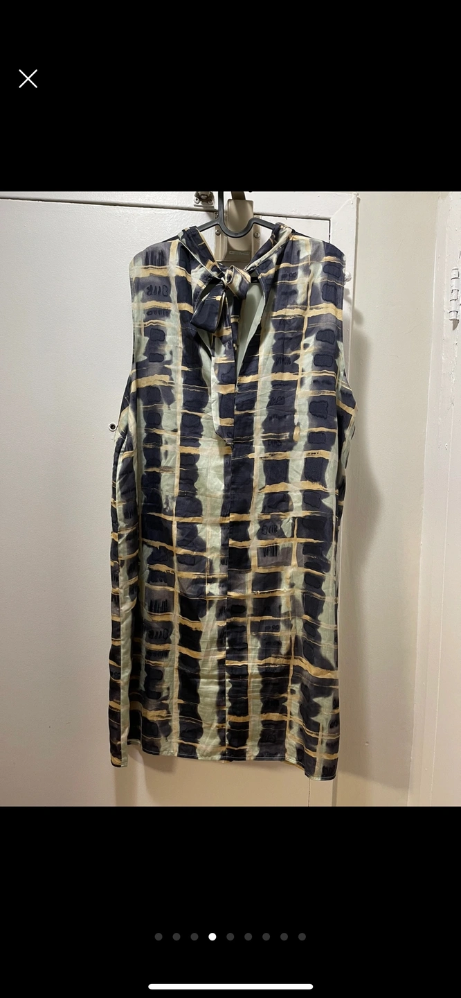 Sleeveless silk blouse with a tie neck, abstract pattern, and a loose fit.