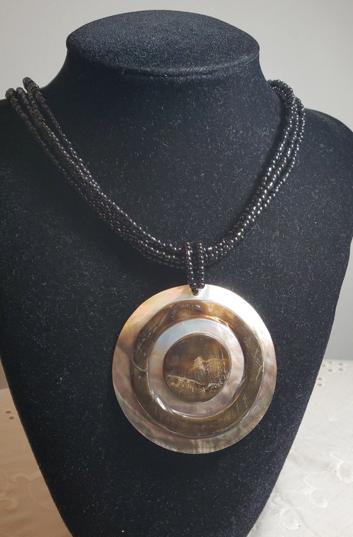 Large round mother of pearl pendant with layered circles, on a black seed beaded chain. Vintage.