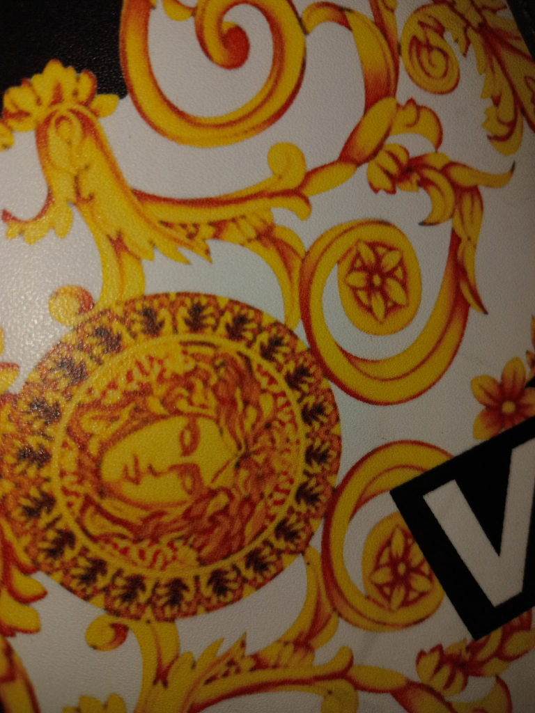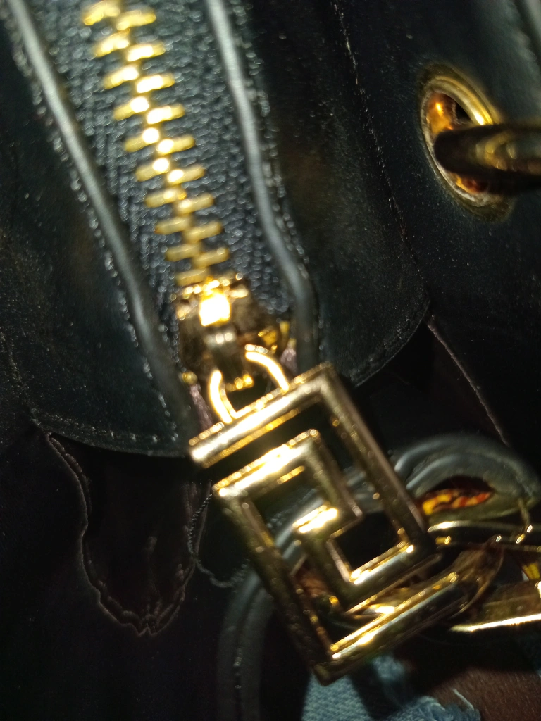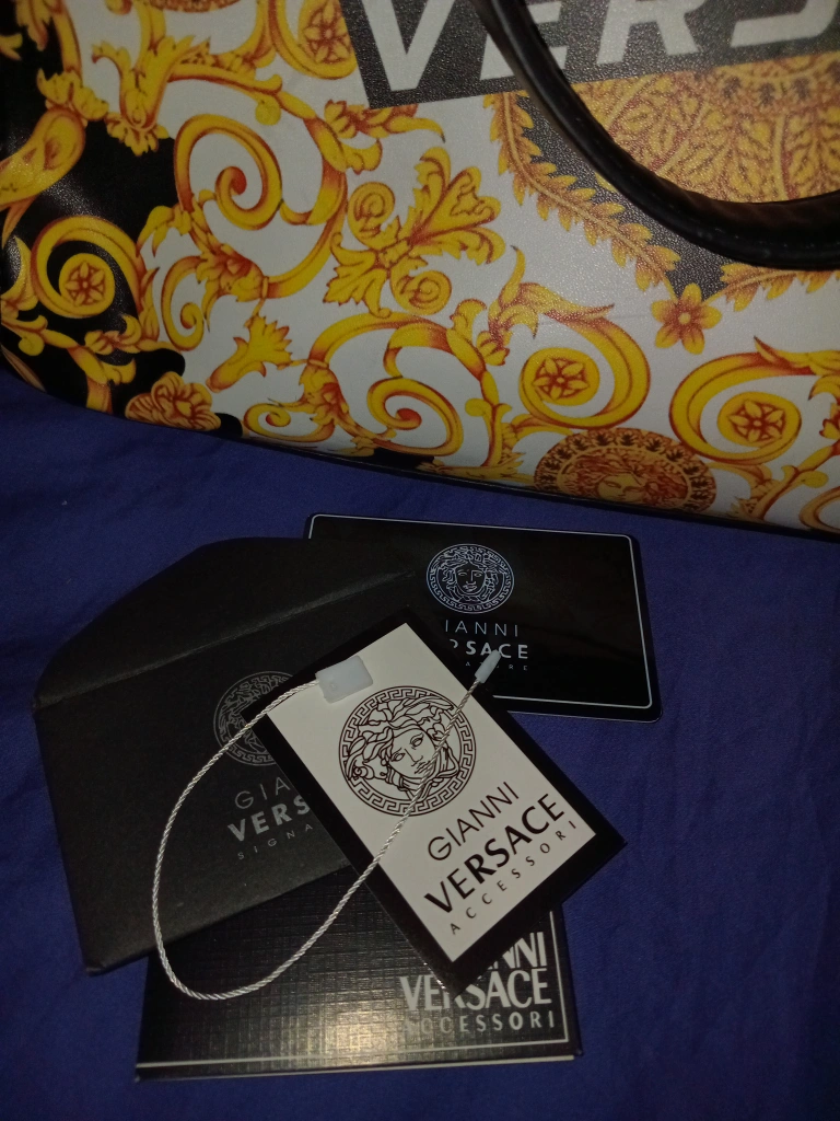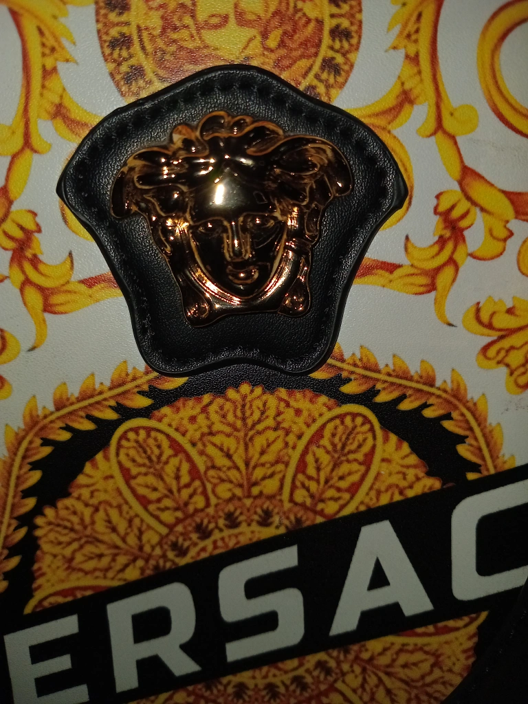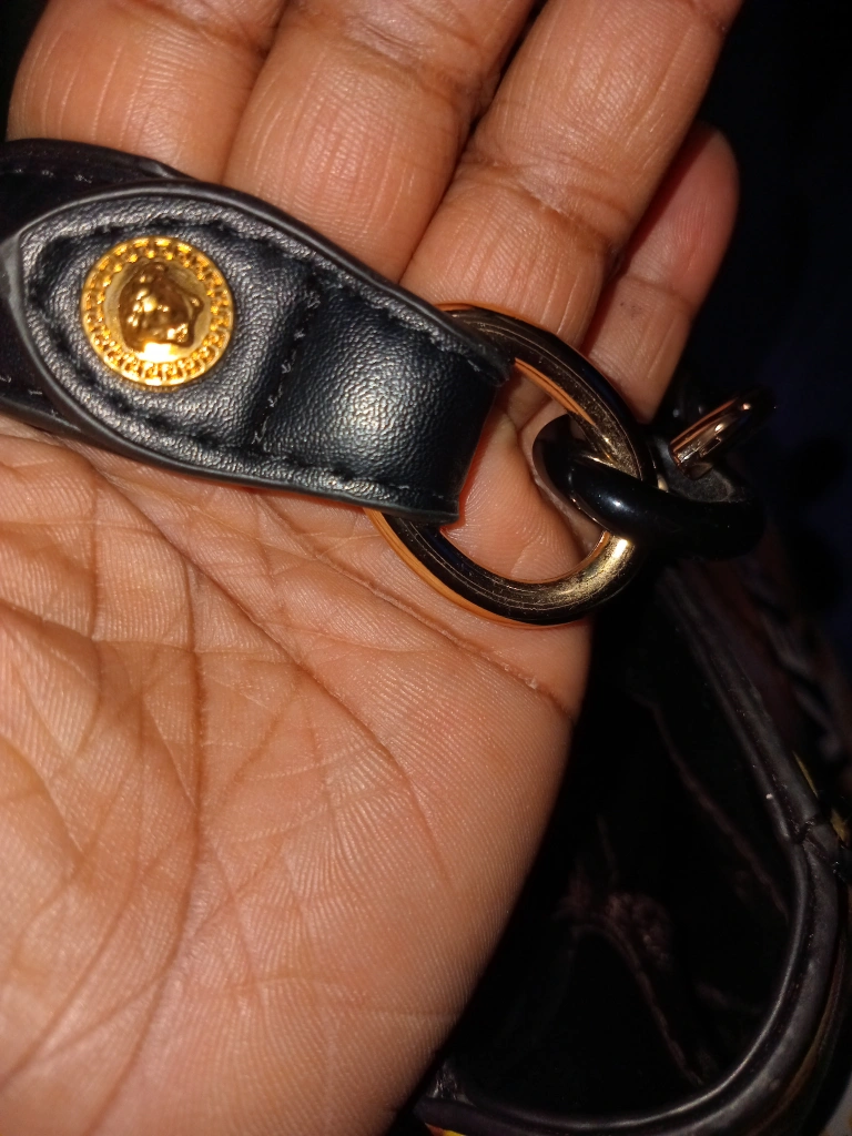 Black handbag with gold accents. Features a gold chain strap and a gold Versace logo. Bag has a white and gold Versace pattern.