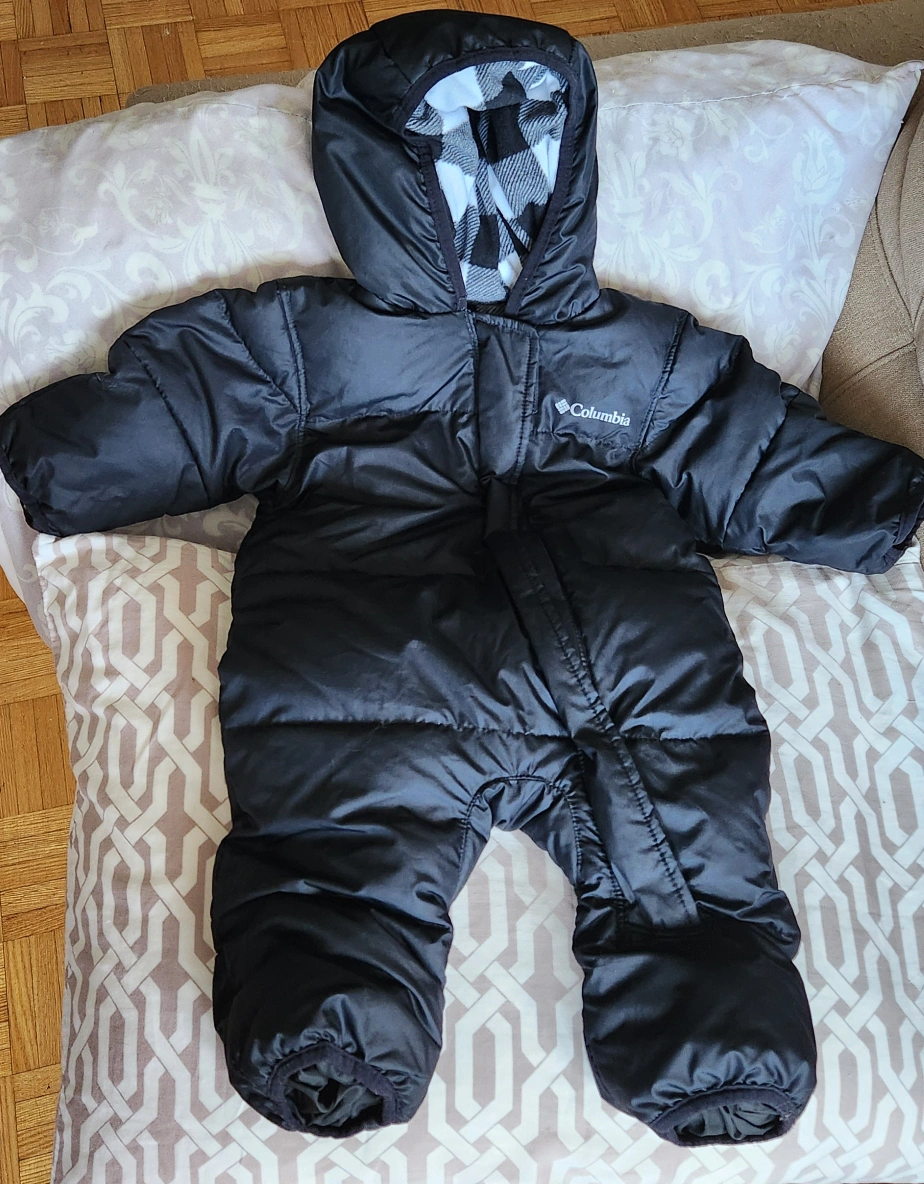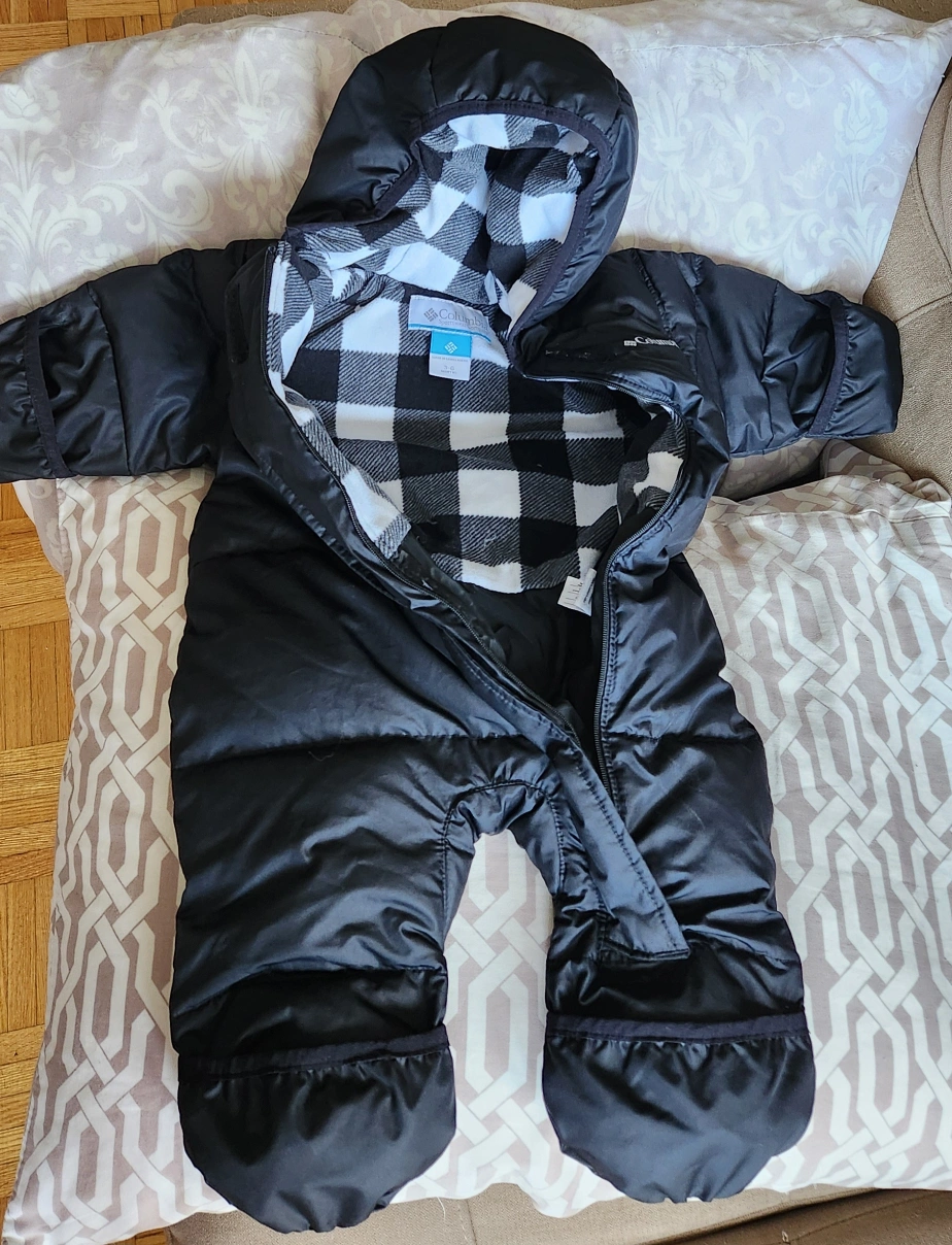 Black snowsuit with a plaid lining. Zipper closure. Feet and hands are covered. 3-6mnths pickup cawthra and lakeshore