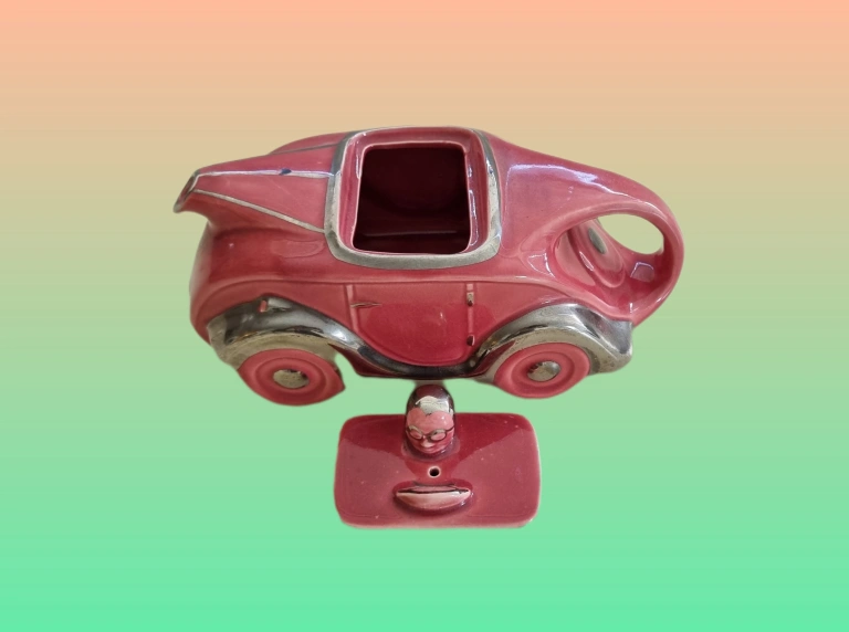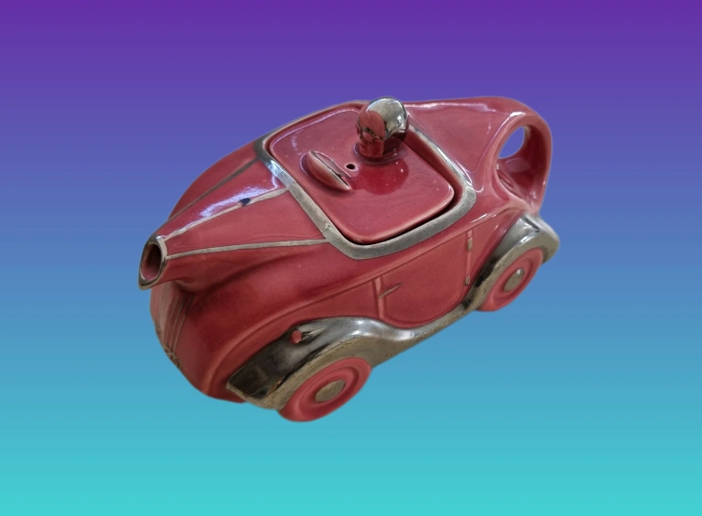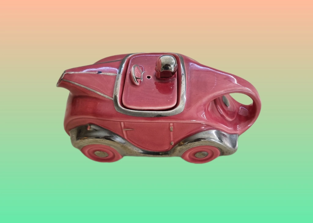 Pink and silver antique vintage unique car shaped teapot. Includes lid.