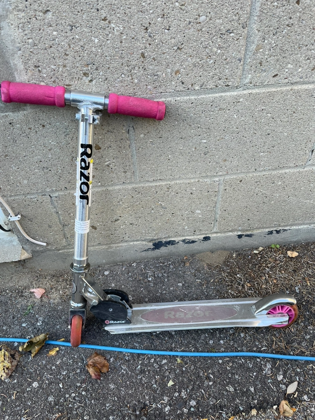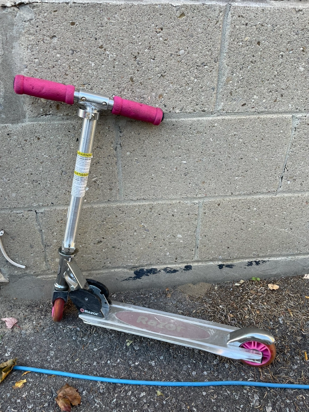 Used Razor scooter. For kids. Pink handlebar grips, pink wheels, and a silver frame.