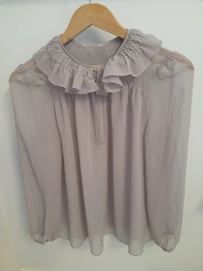 Still Available! Long-sleeved blouse with a ruffled collar and button closure. Sheer and lightweight fabric. Armpit to armpit: 20.5" From collar to hem: 23" Downsizing. No issues. Cash and Porch Pickup close to Willowdale Middle school area. PLEASE check distance before responding!