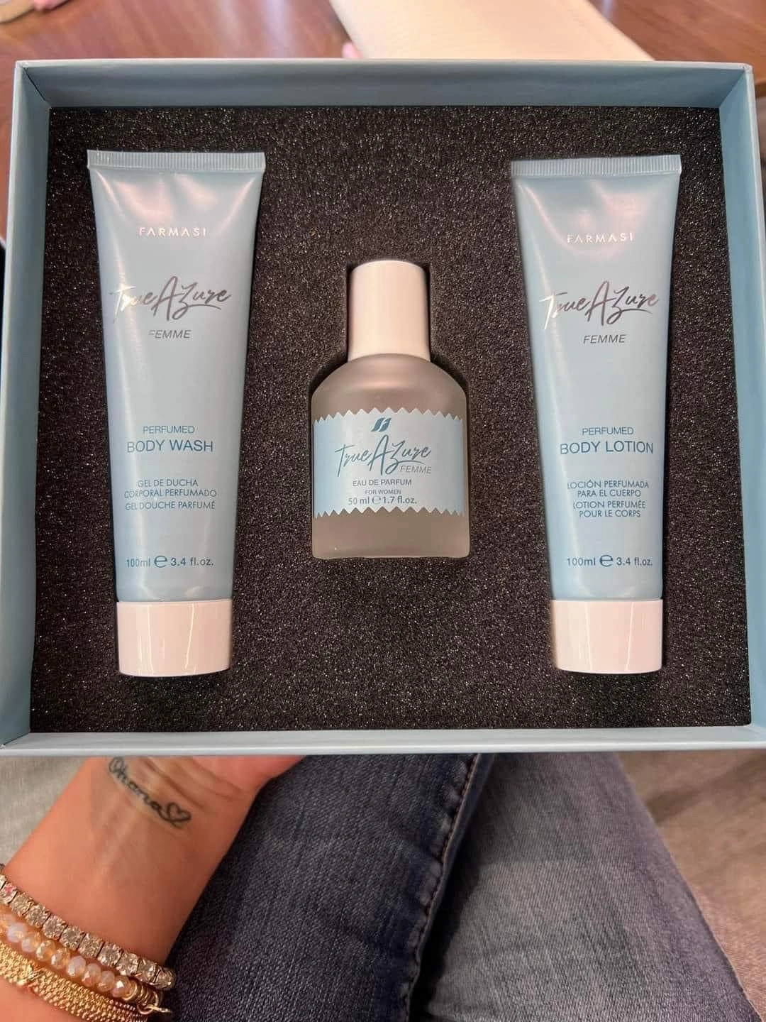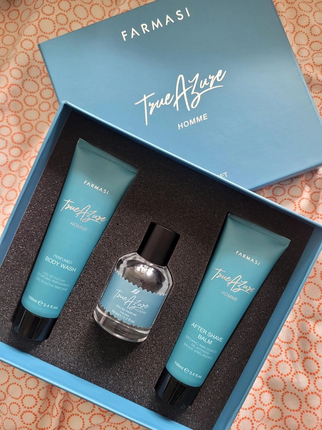Gift set includes body wash, cologne, and after-shave balm