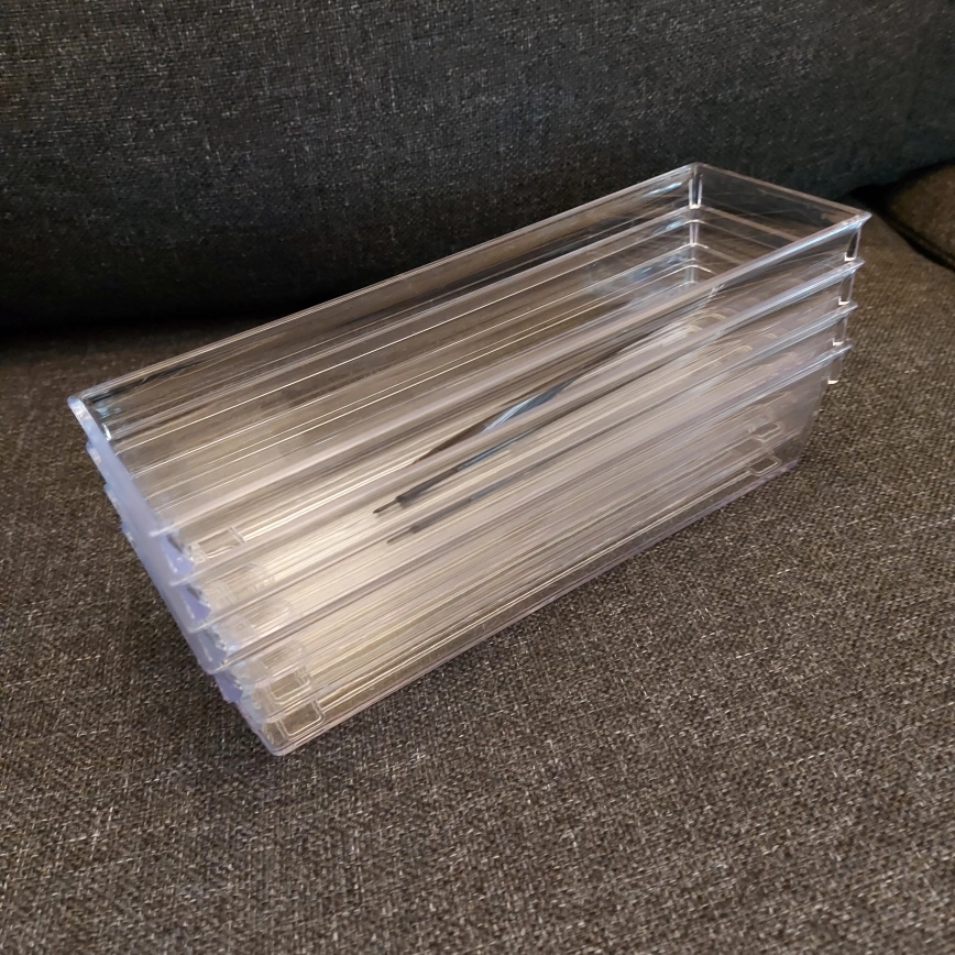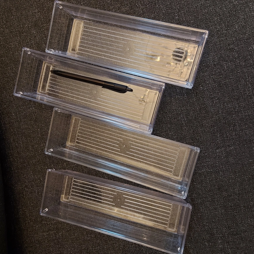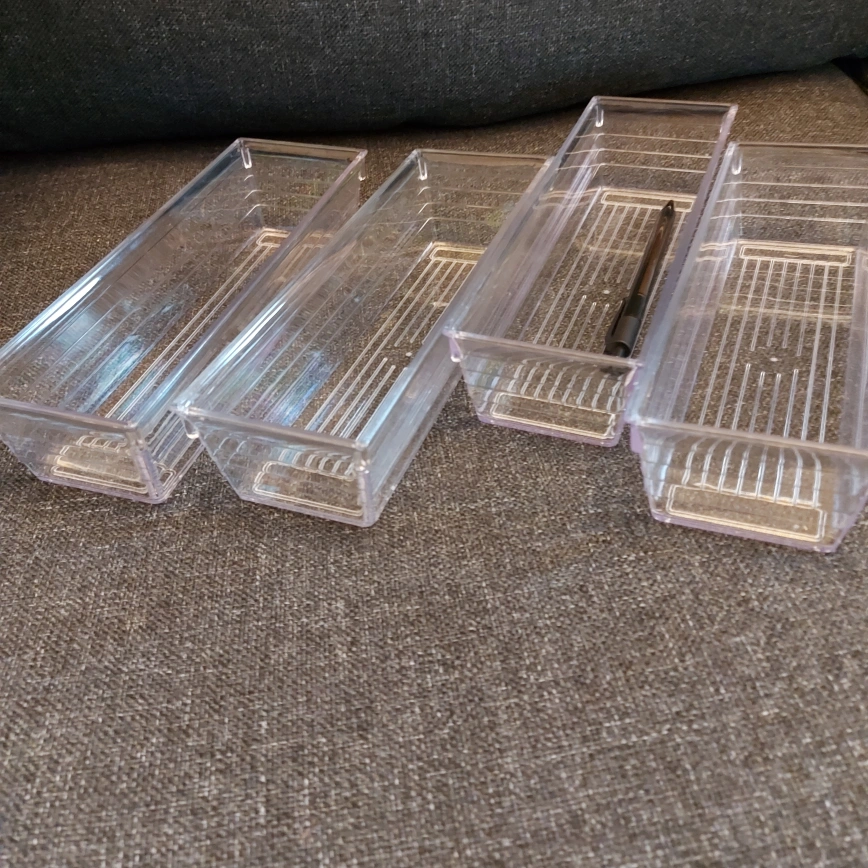 Set of 4 small clear plastic storage bins. Ideal for organizing drawers or shelves. Pen for scale.