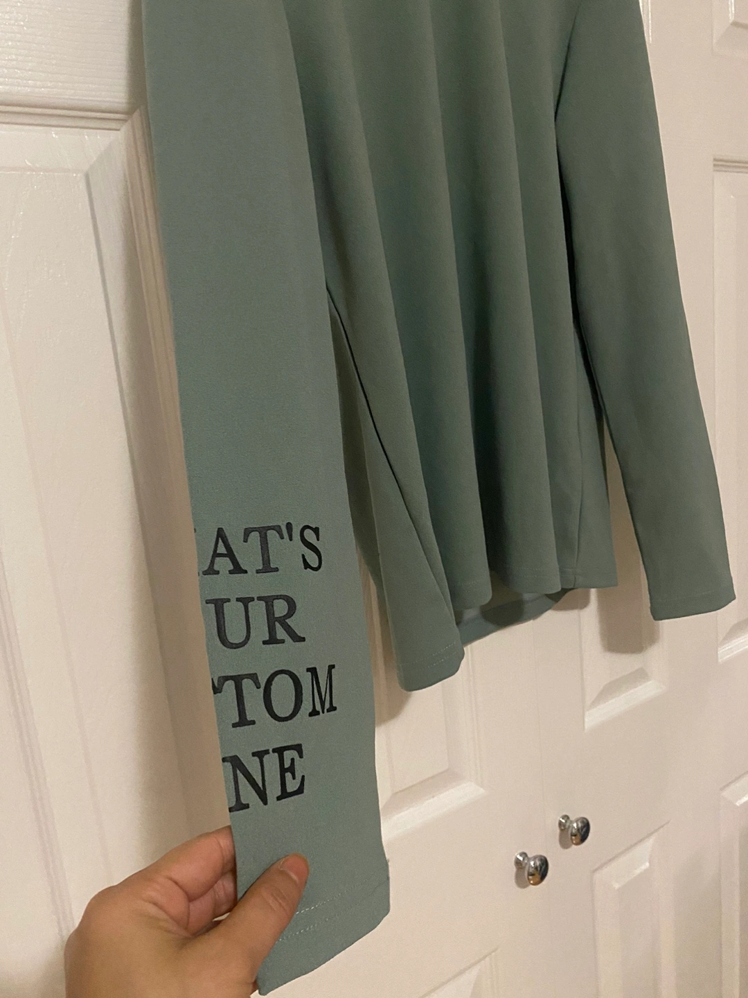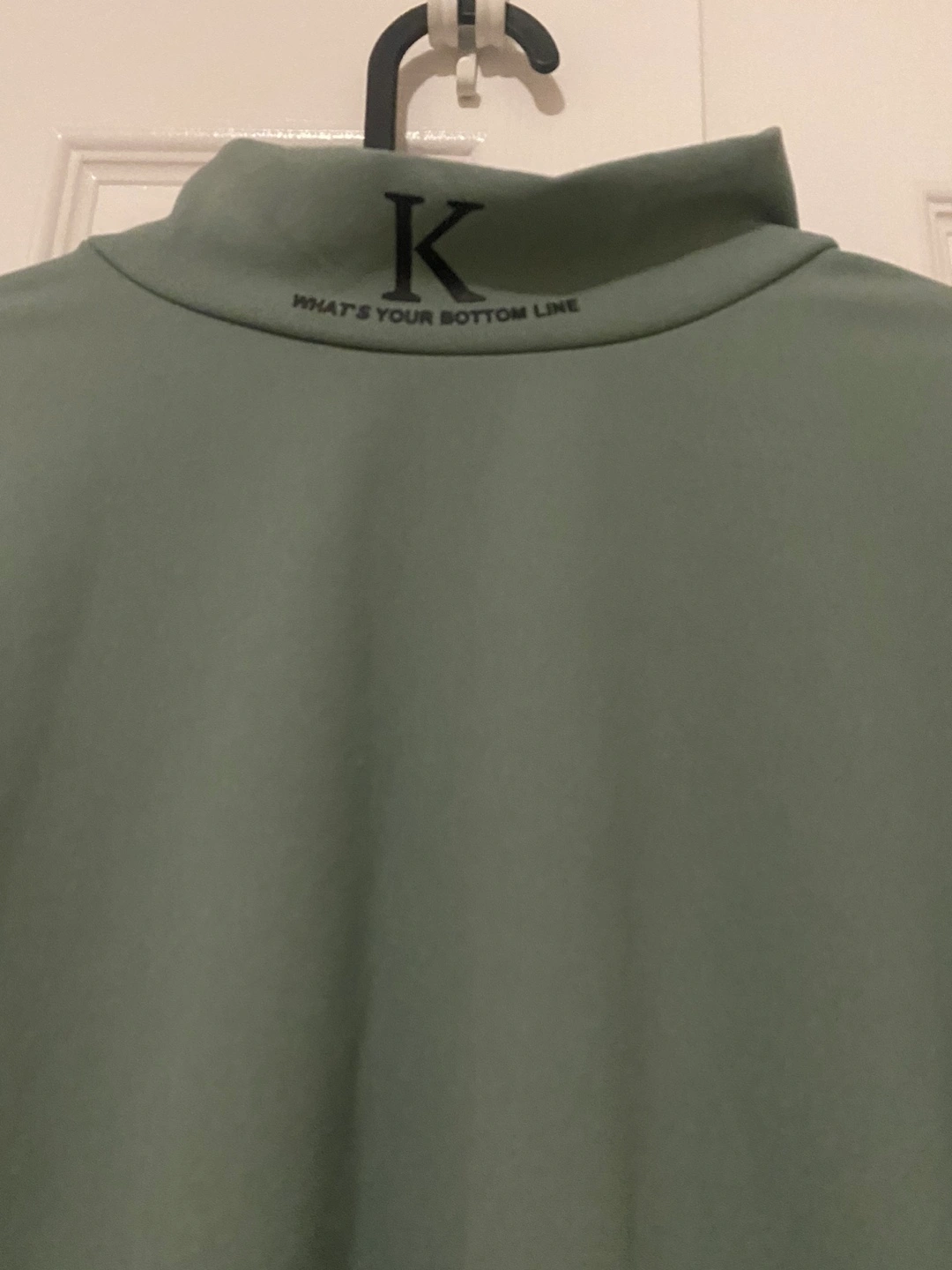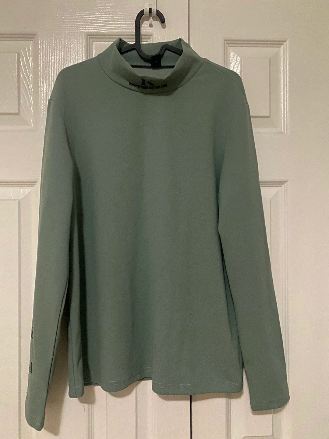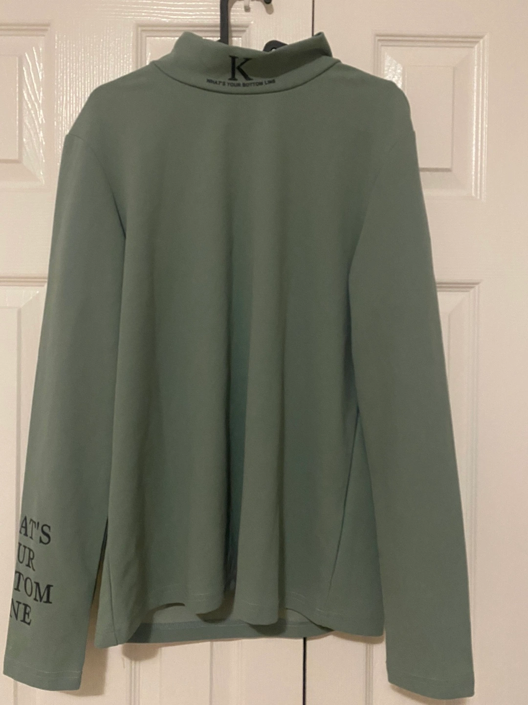 Long sleeve mock neck shirt in green with black writing. Has a K on the back and a phrase on the sleeves.