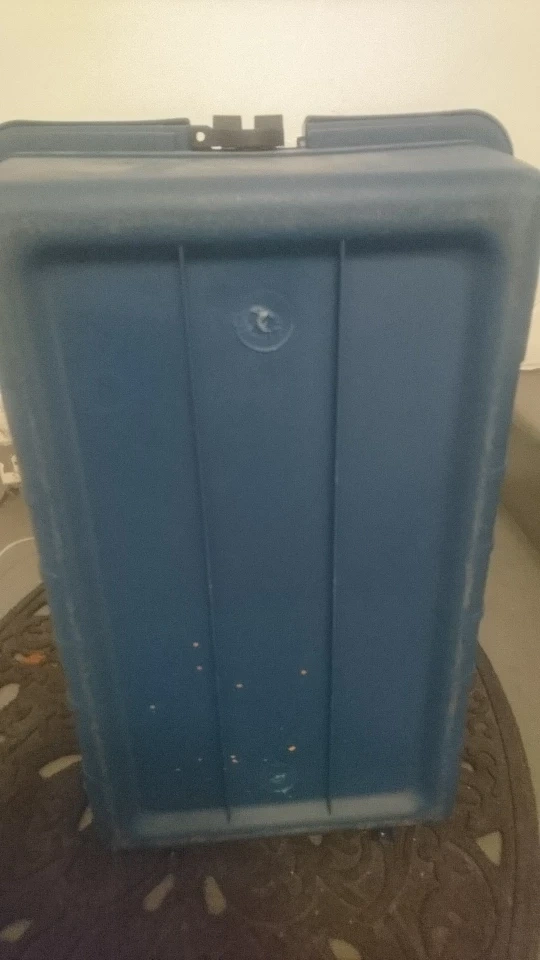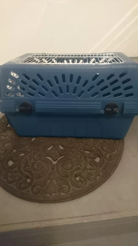 Blue plastic Pet carrier Cat Carrier with two doors and a metal wire top. Size is 11 inches wide inside, Top opening is 8 inches wide. 17 inch long and 10 inch High. Pick up Dupont and Ossington