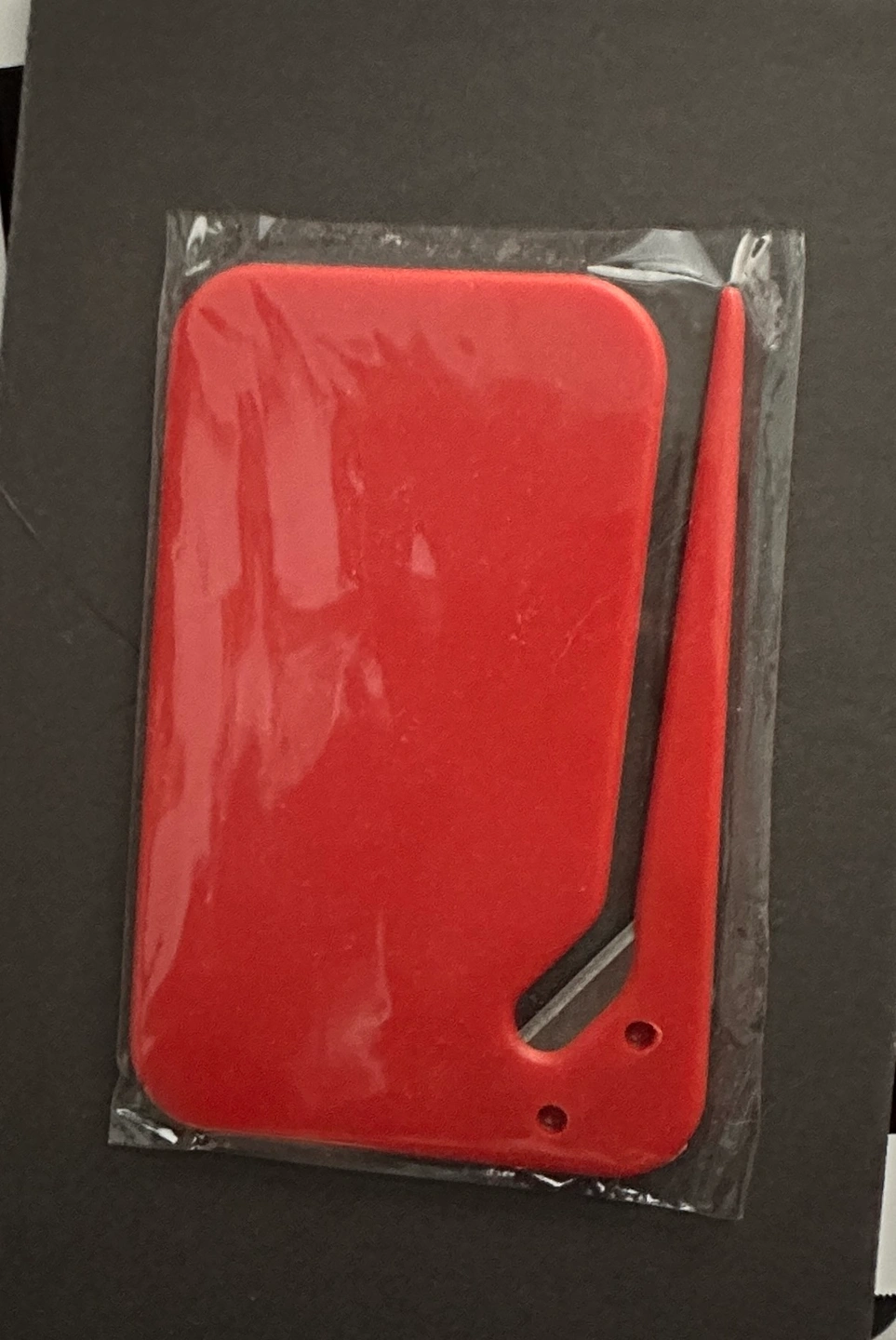 Red plastic utility cutter can be used as letter opener, gift wrap slicer or even detangle clumps of cat fur.