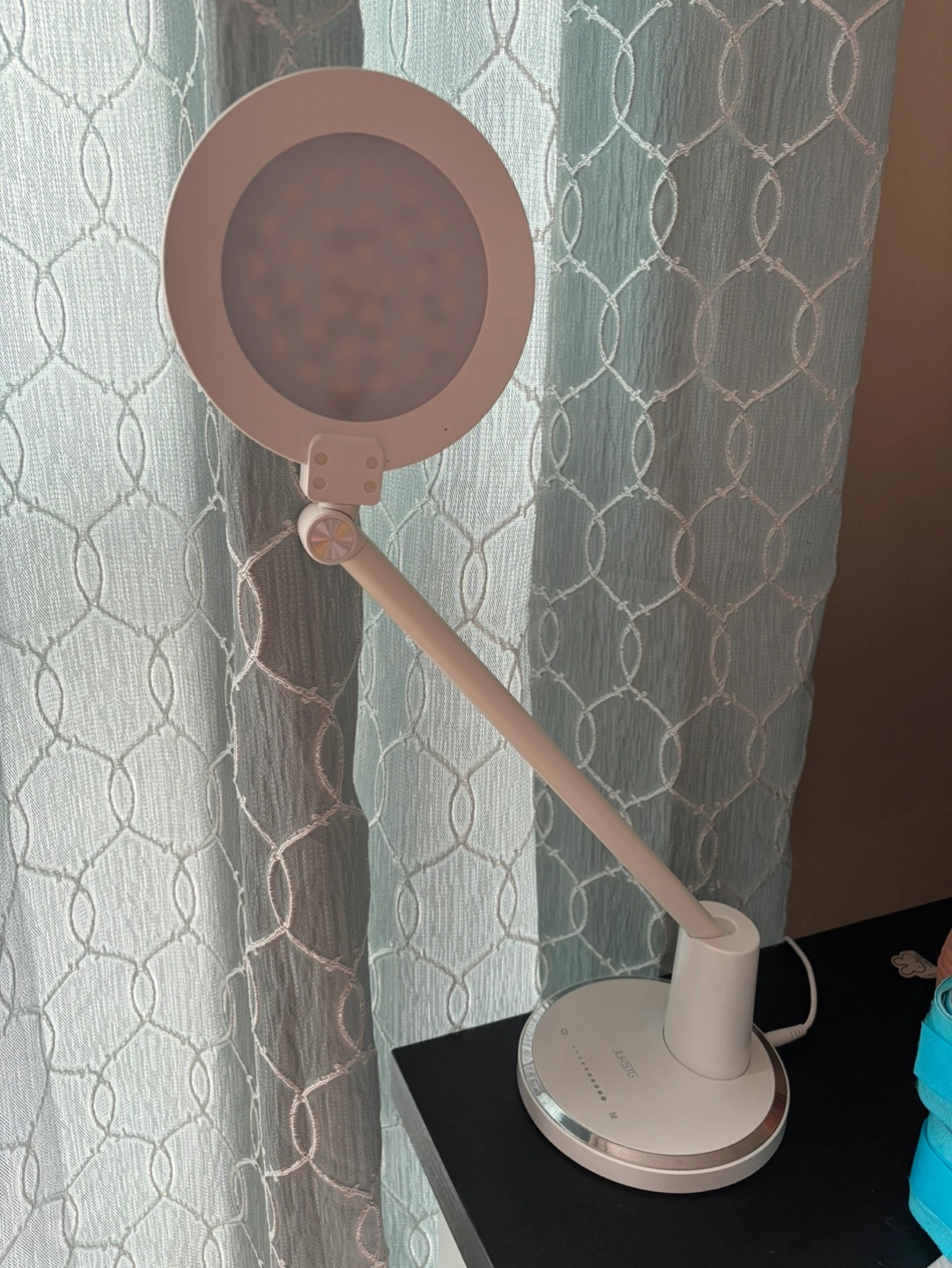 White desk lamp with a round light panel and adjustable brightness. Includes a power cord.