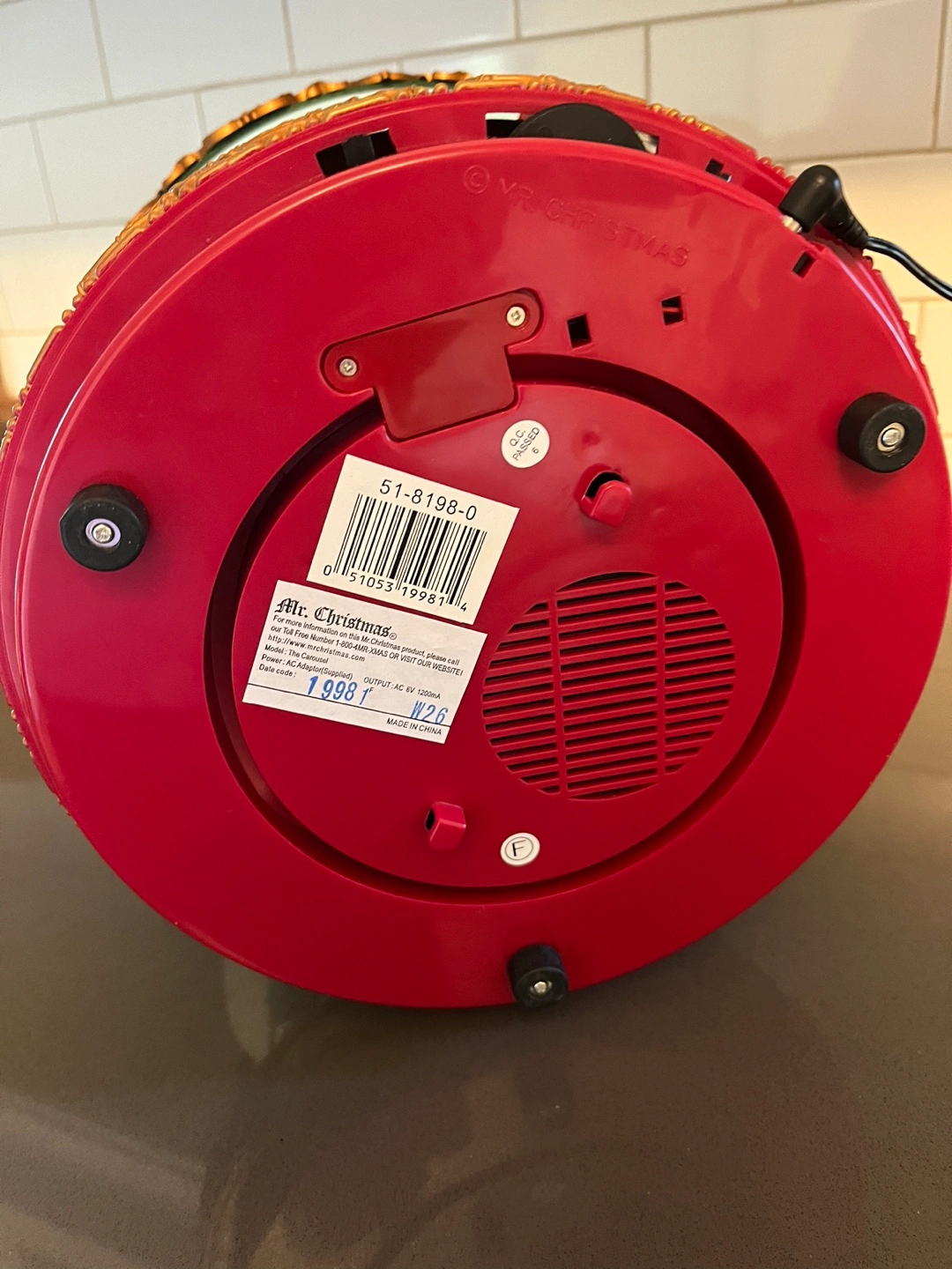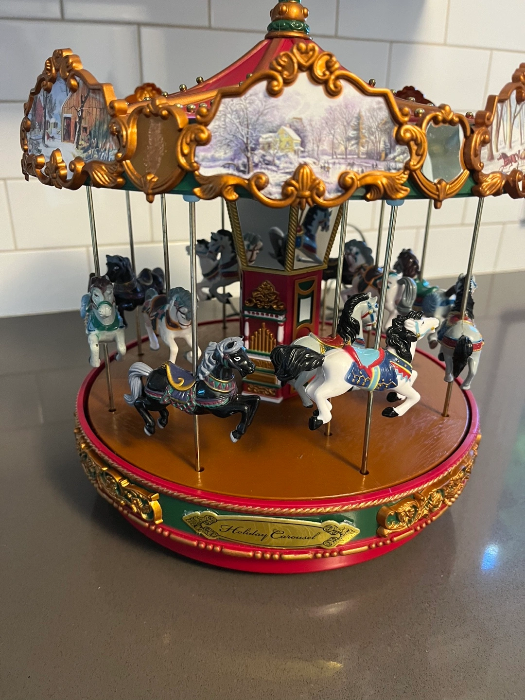 Mr Christmas Carousel, plays 15 classsic Christmas Songs, unfortunately it doesn’t turn, lights work. 12” in height, 10” in diameter, pick up in Utopia