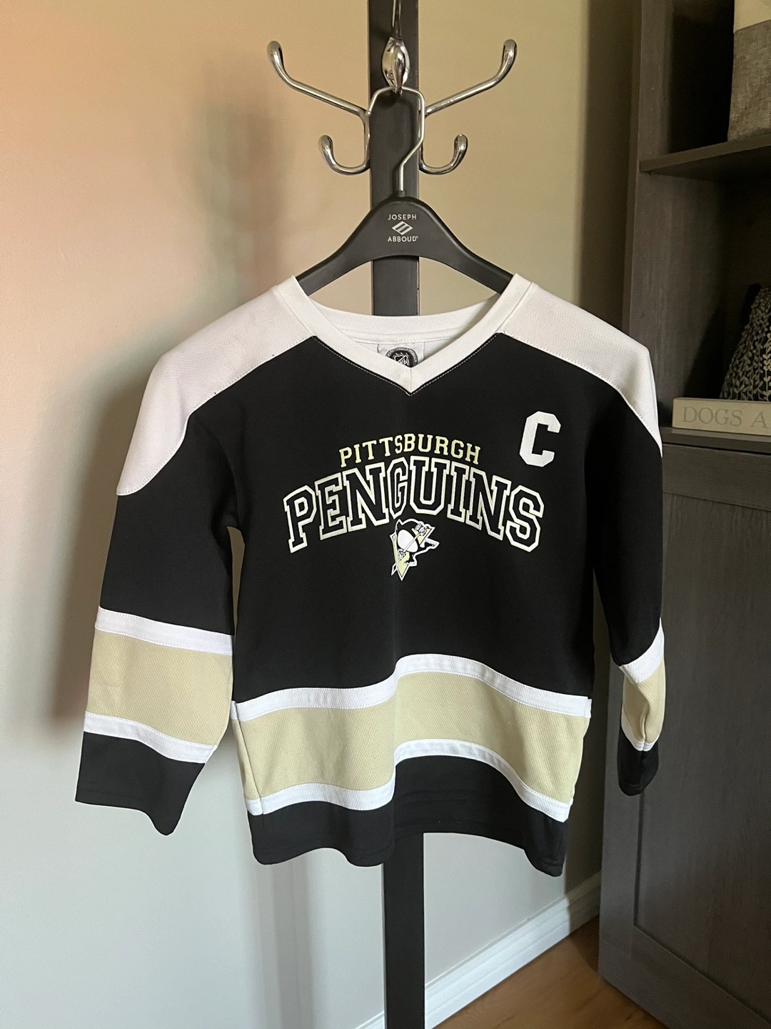 Black and white hockey jersey with gold accents. Crosby 87 on the back. Size Small (8)