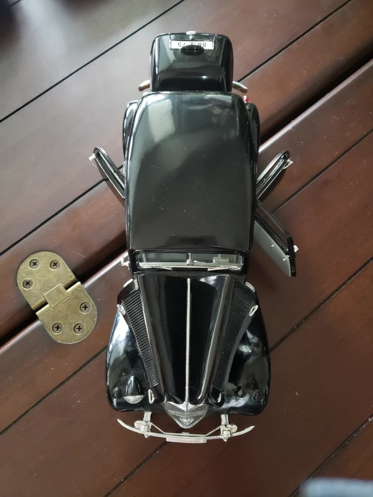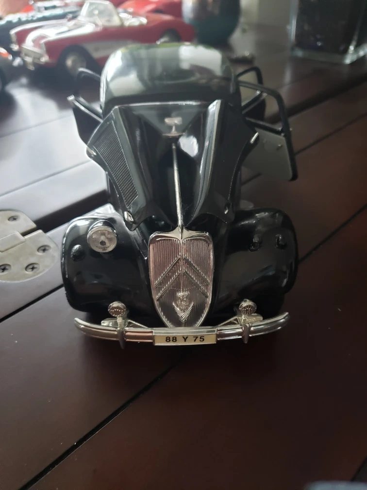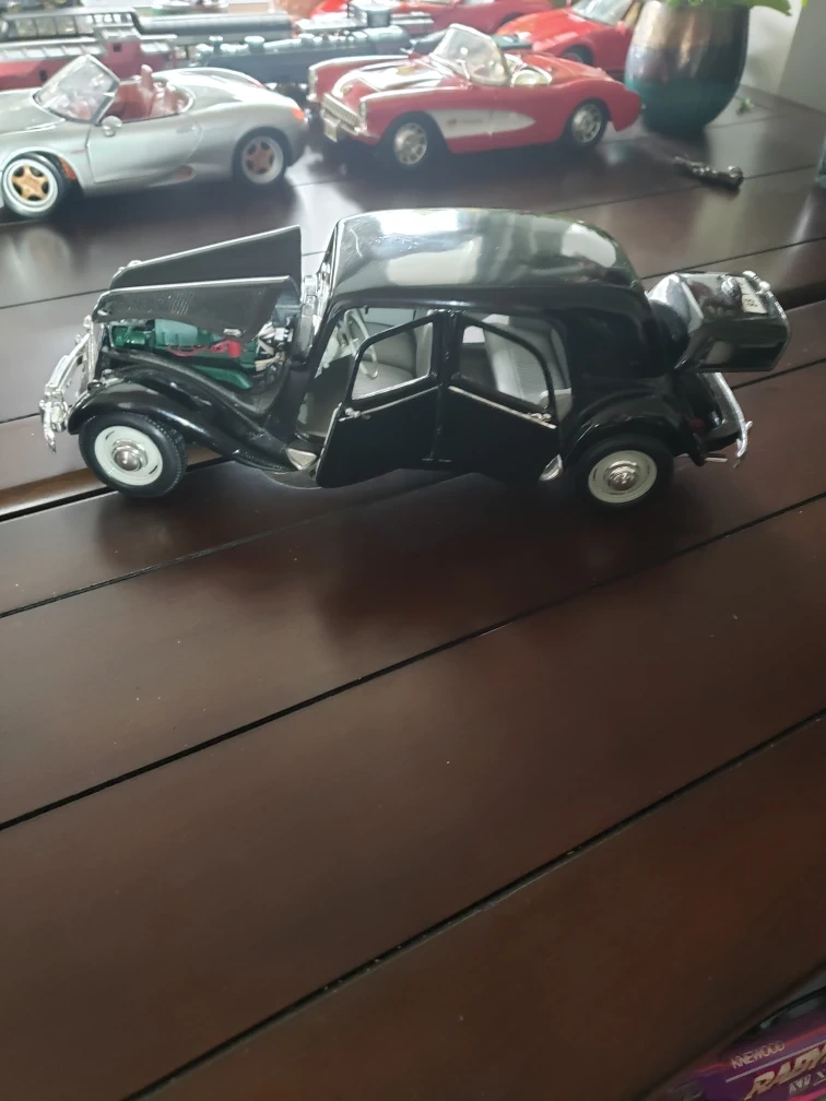 Black die-cast model car. Doors and hood open. Excellent condition. Special 1952 Citroën with detailed engine and interior, suicide doors model, solid and heavy, very well made, it's a model for the serious collector