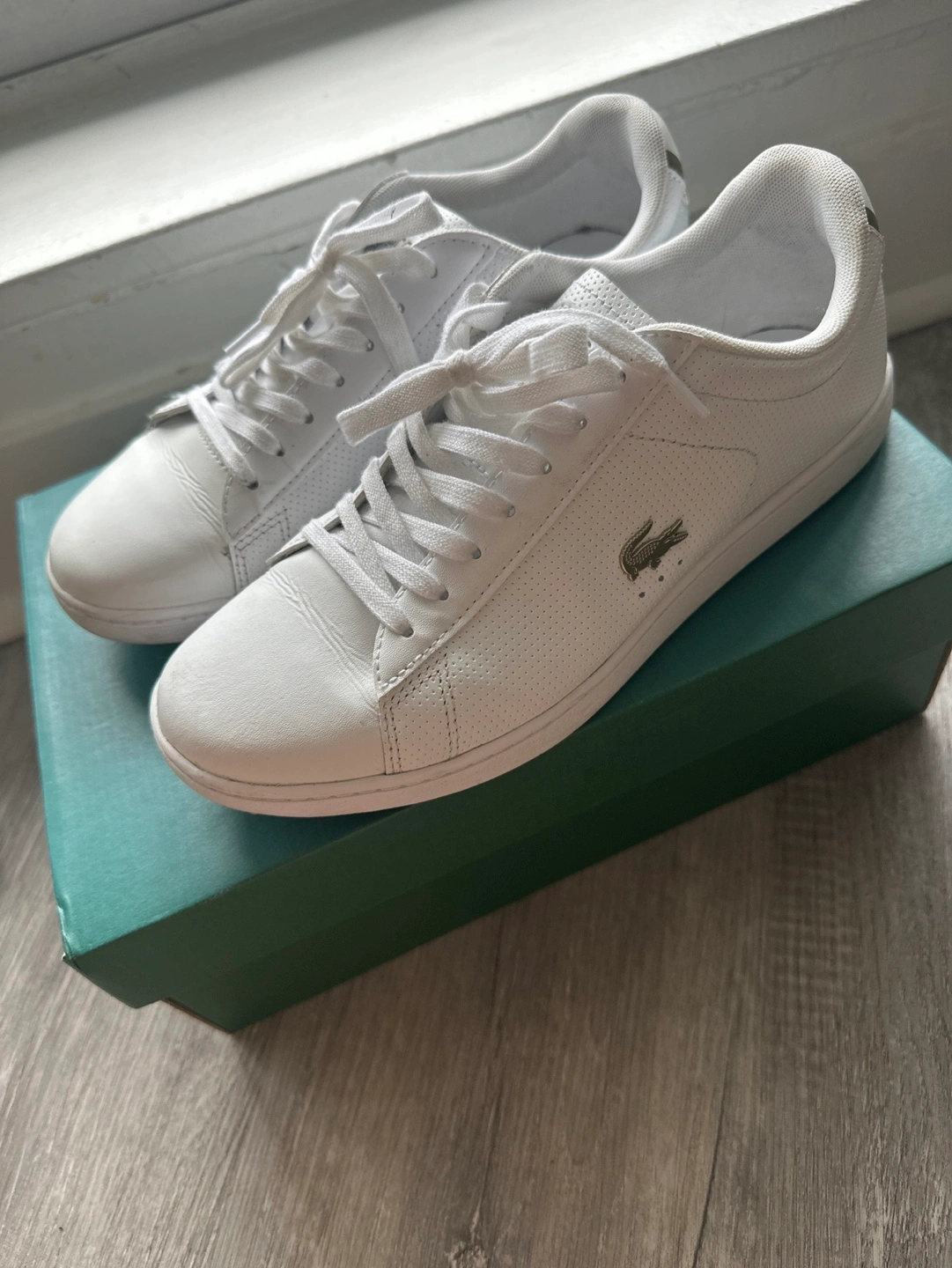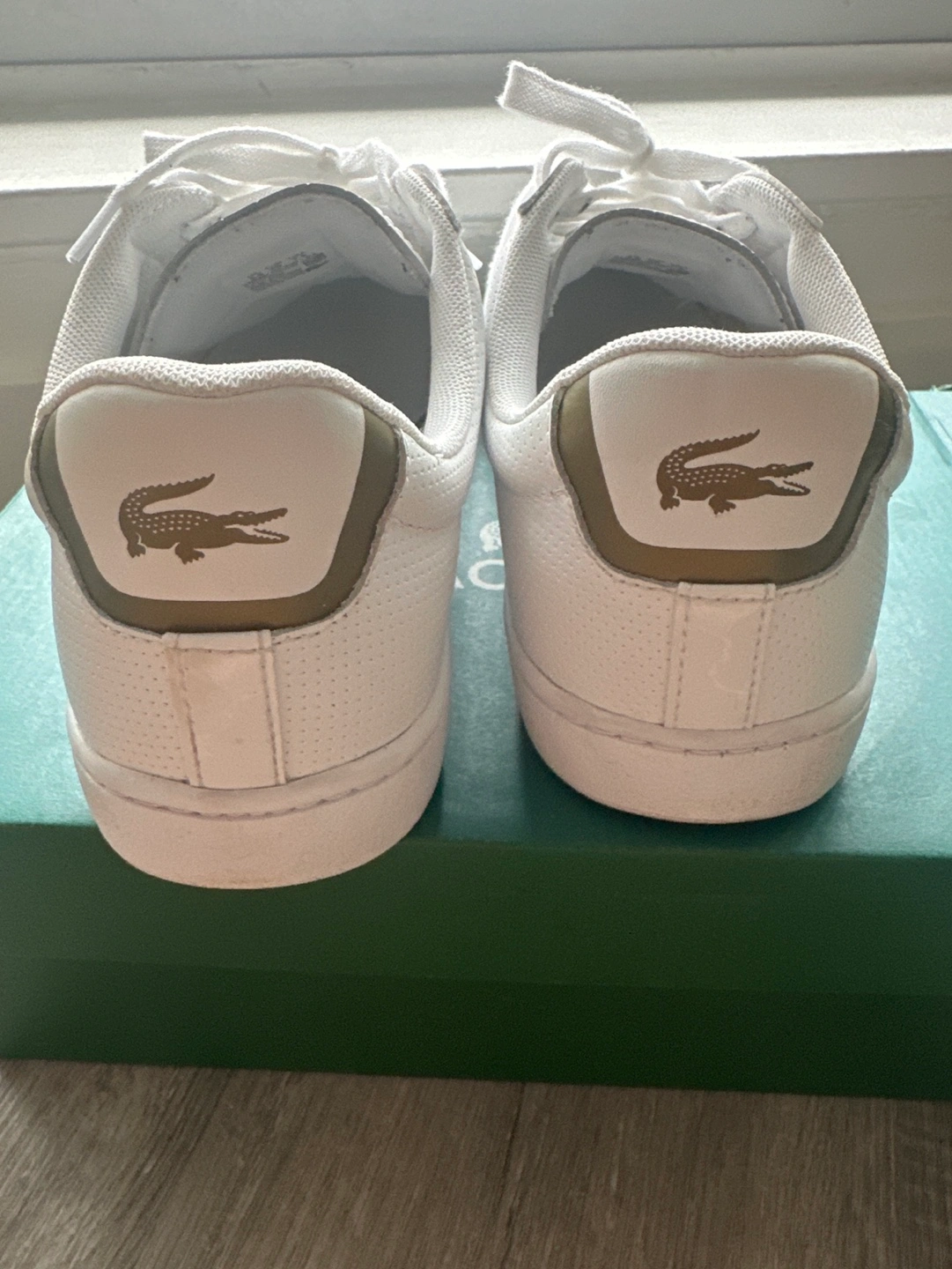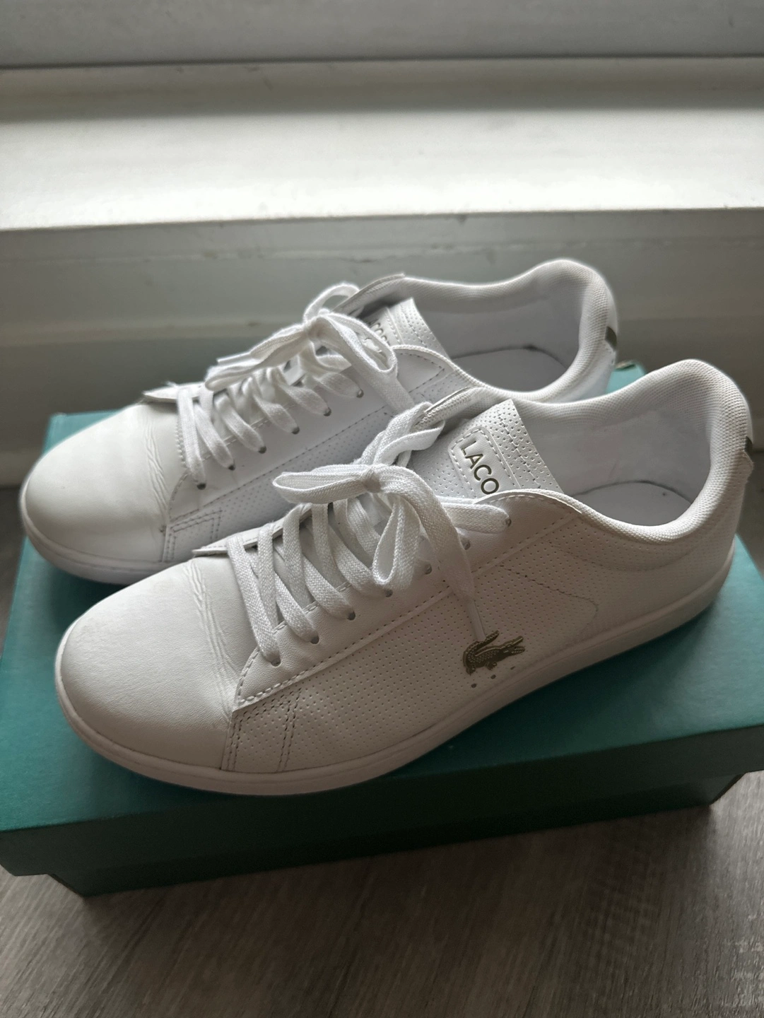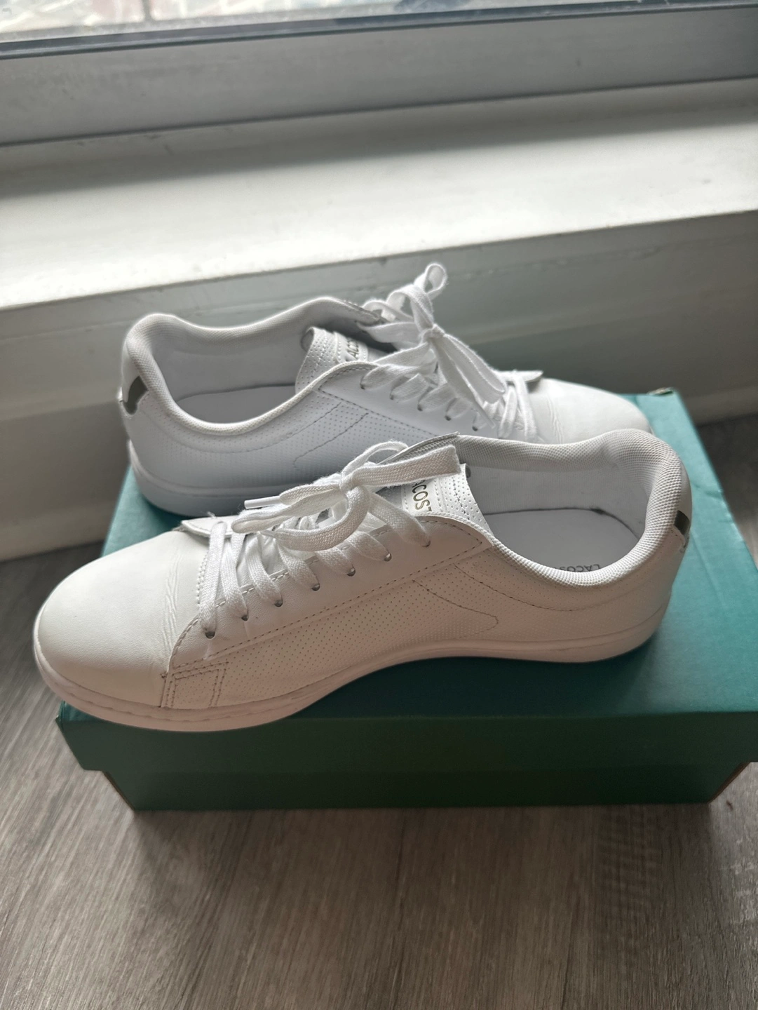 White leather sneakers with a crocodile logo. Lace-up closure. Lightly worn once for a work shift, and though cute, give no arch support. ๐ญ In good condition. Includes original box. Over 50% off retail!