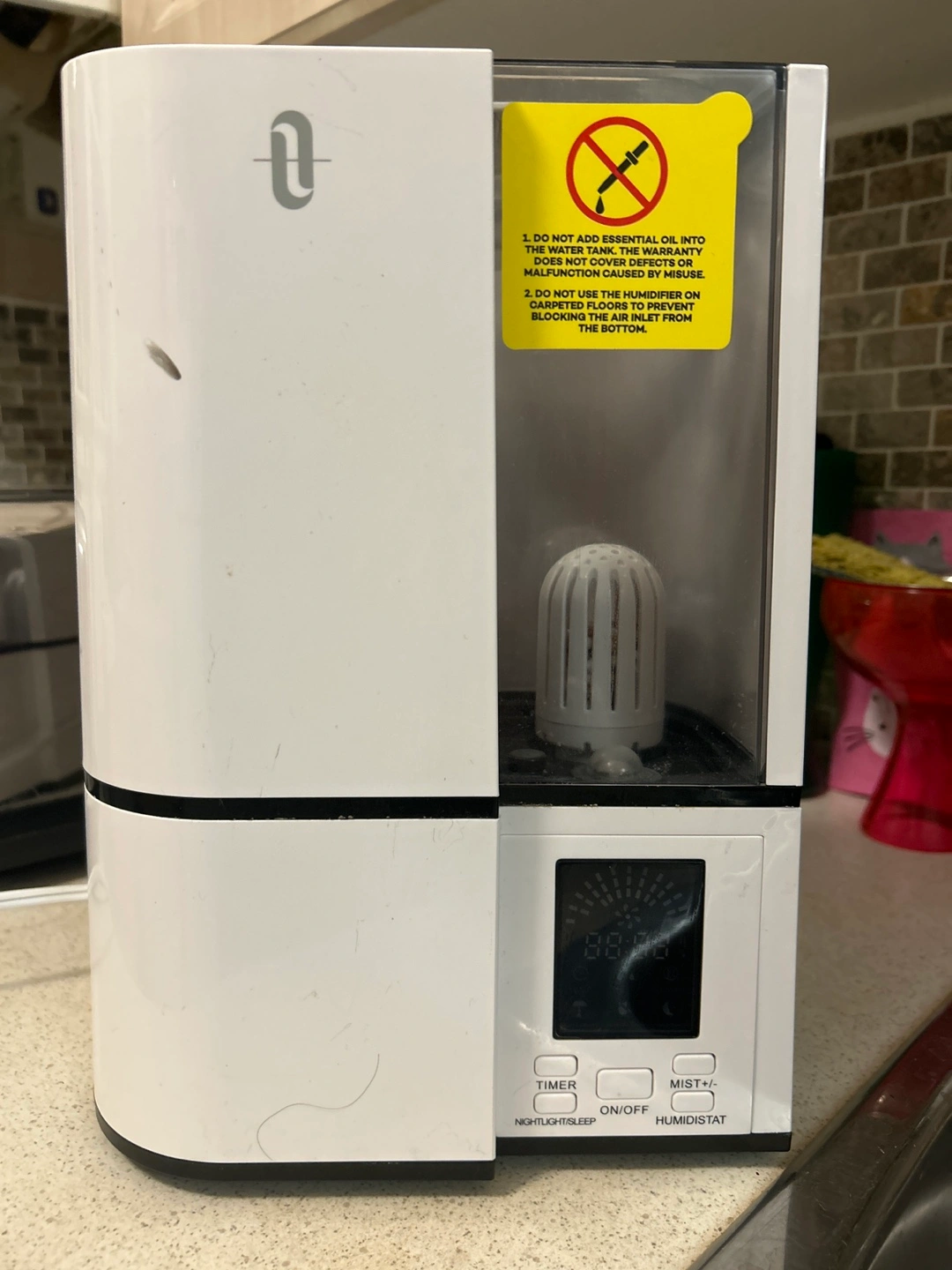 White humidifier with digital display, timer, and night/sleep function. Includes a removable filter.