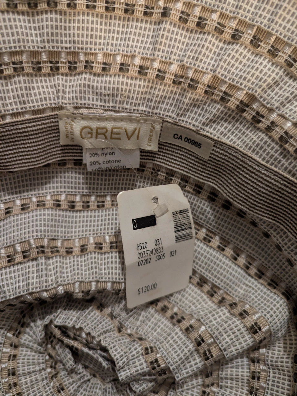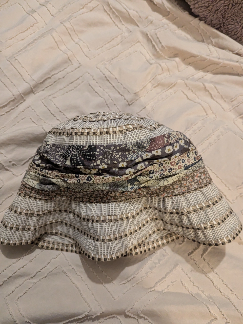 Floral sun hat with brown, cream, and grey pattern. Has a wide brim and is made of a lightweight fabric. bought from Holt Renfrew $120 + tax wore once with tag, asking for $50