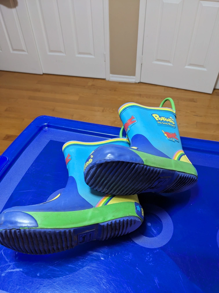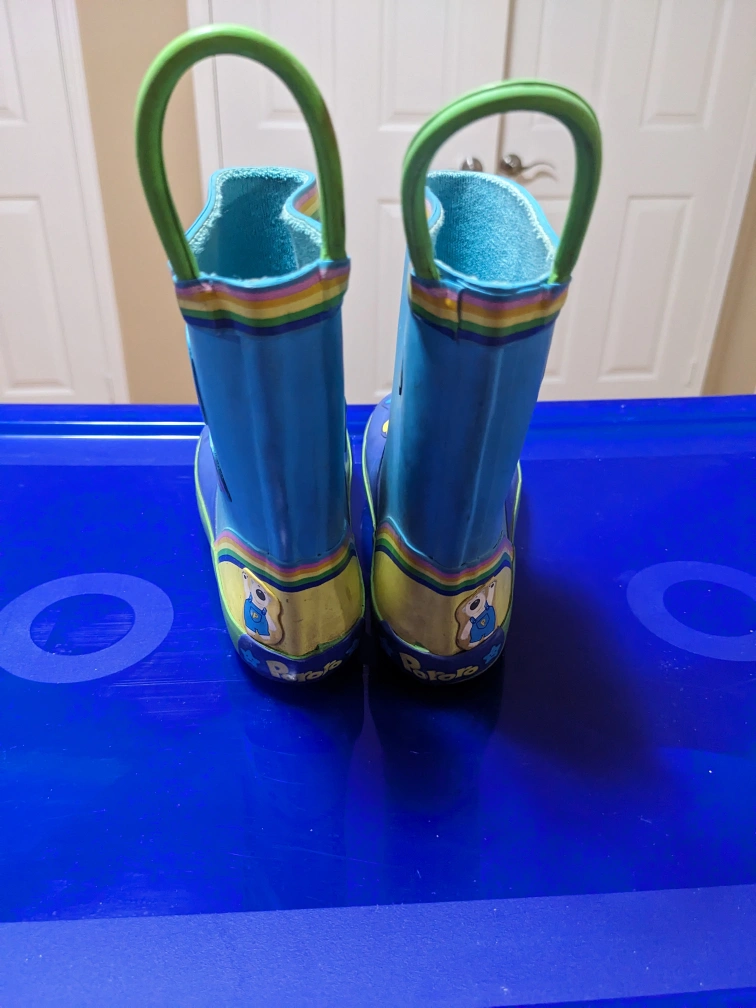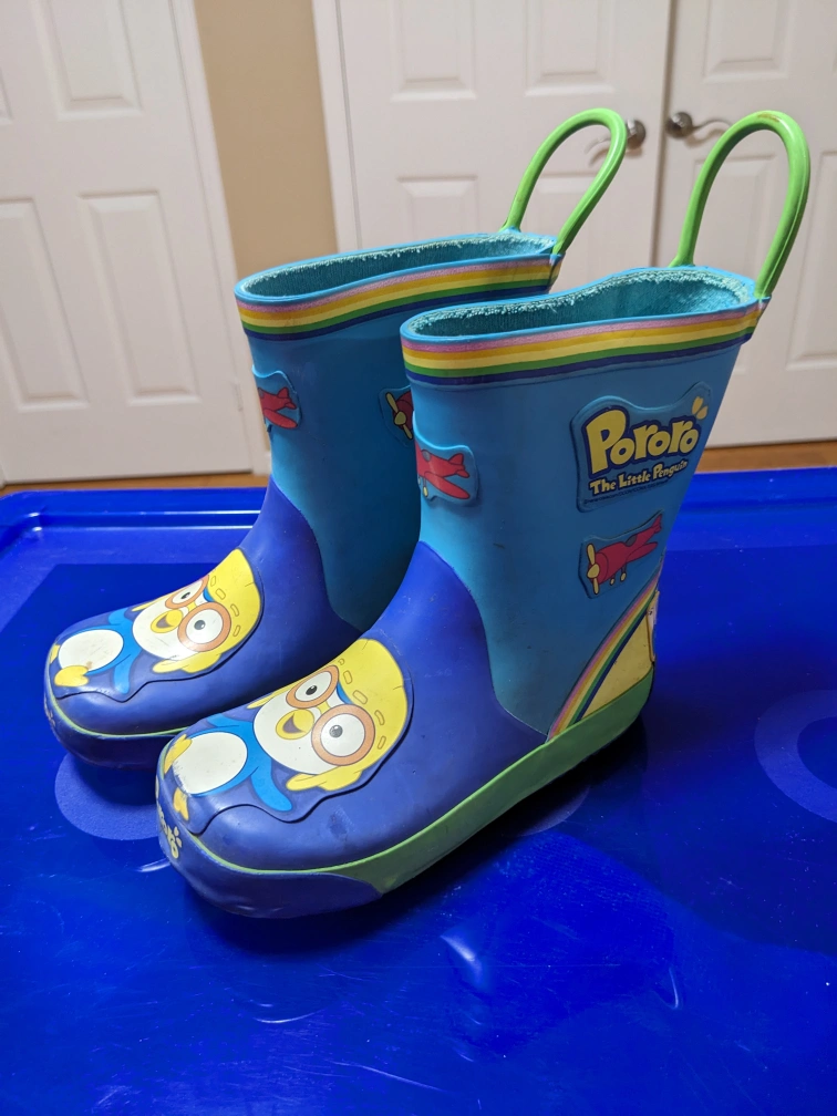 Blue rain boots with Pororo character design. Green handles. Size 10-11