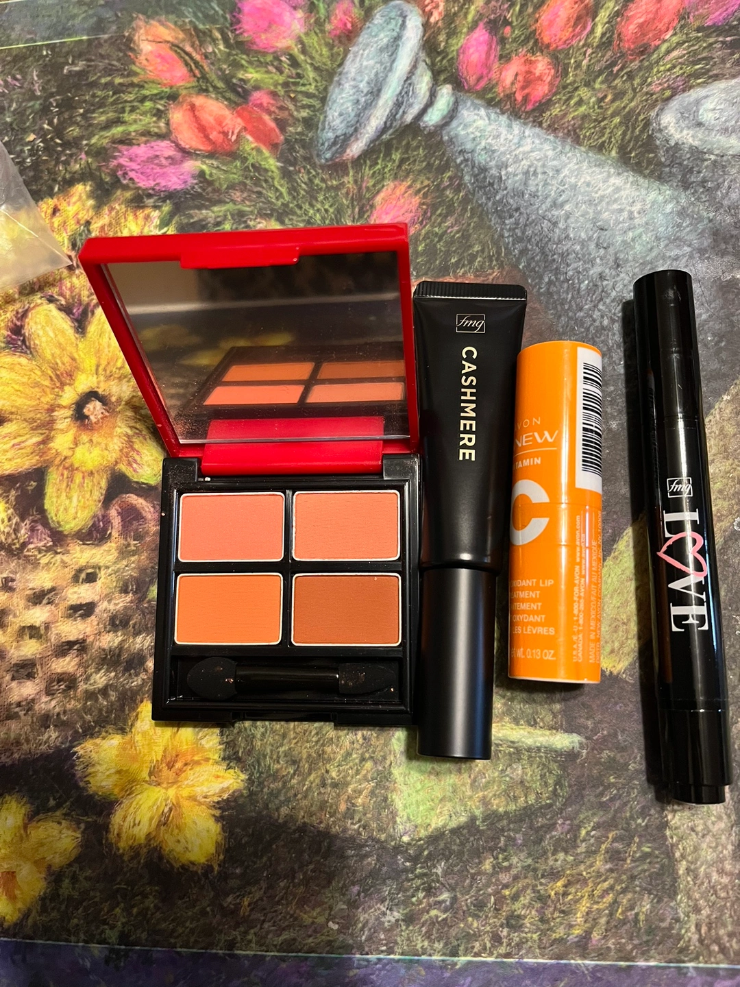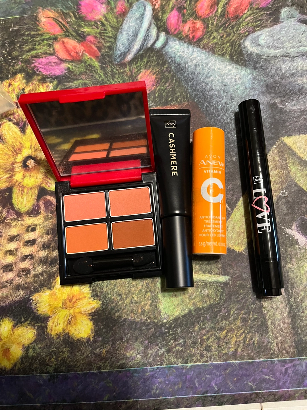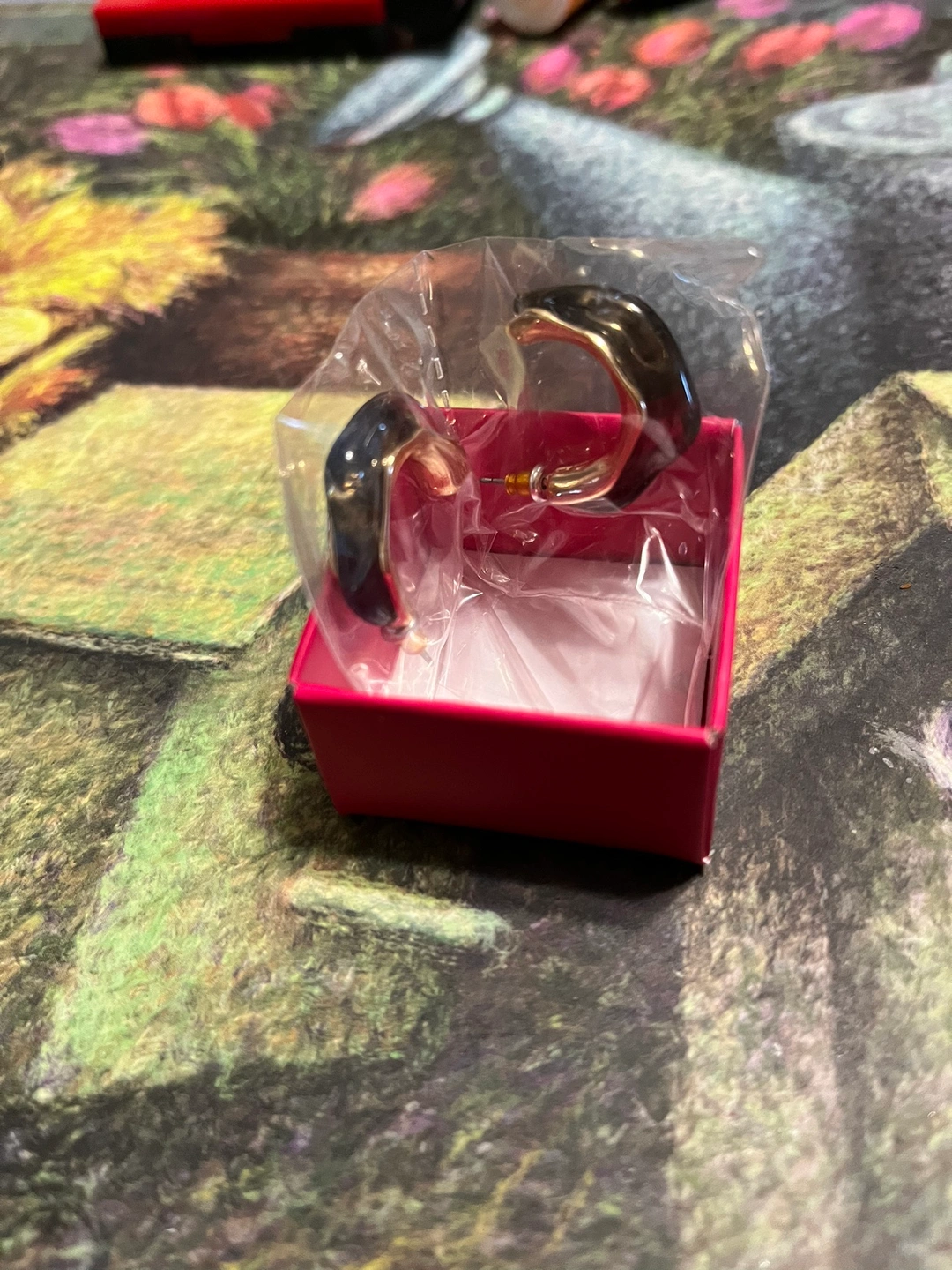 Pair of black hoop earrings. Gold tone. New in packaging. Make up from AVON Eye Shadow, eye primer, Vitamin C Lip conditioner, Lip butter with Flirtation colour. Whole package Free earrings all for $40