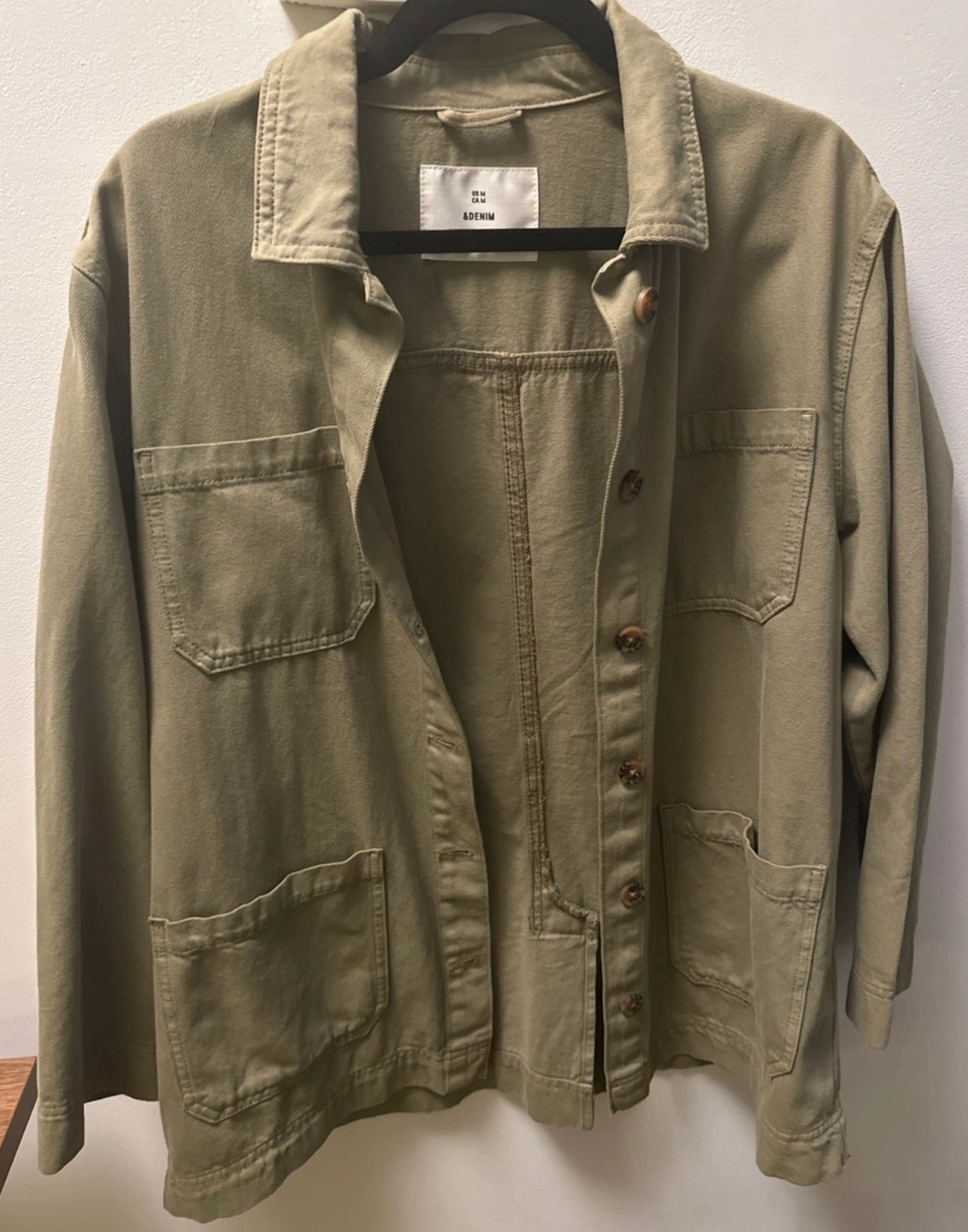 Green utility jacket. Long sleeves, button closure, multiple pockets, and a relaxed fit.