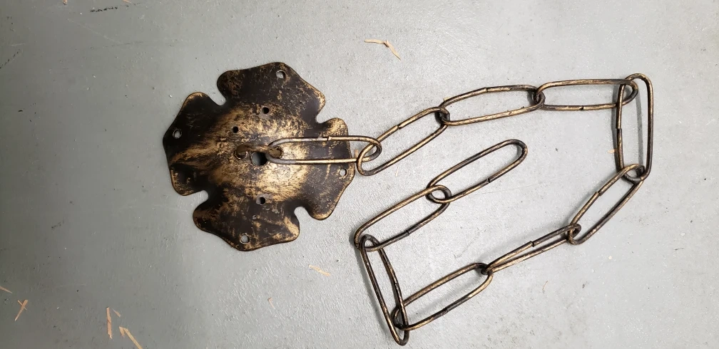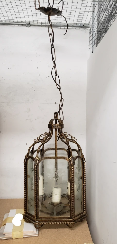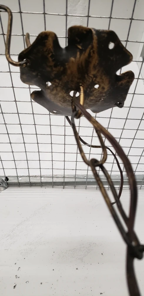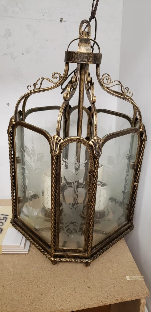 Made of antiqued heavy metal (bronze?), weighing 22 lbs. Measures 24.5” tall x 12” wide x 13.5” diagonal. Uses 4 candle bulbs. Pick up only. Cash only.