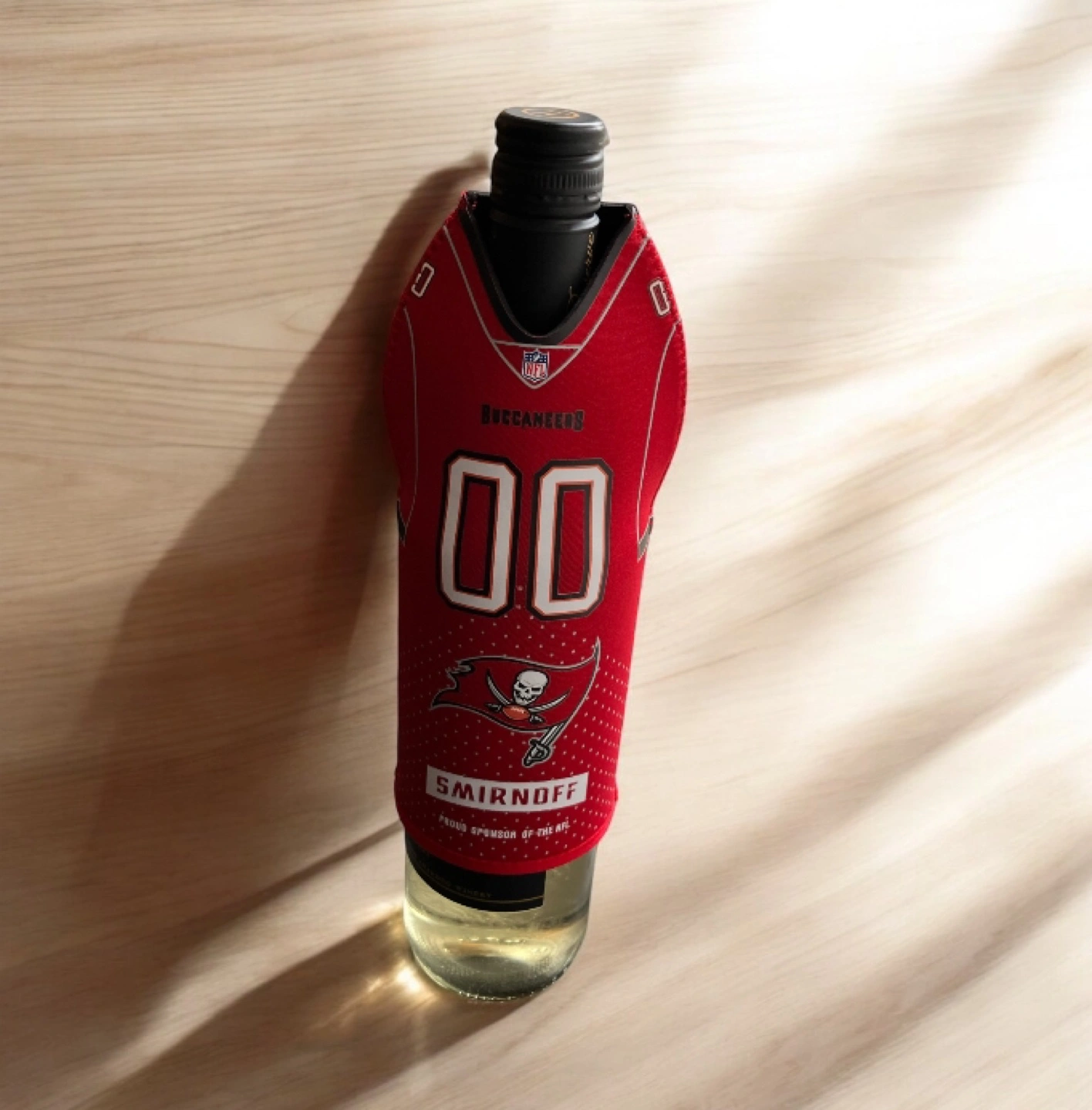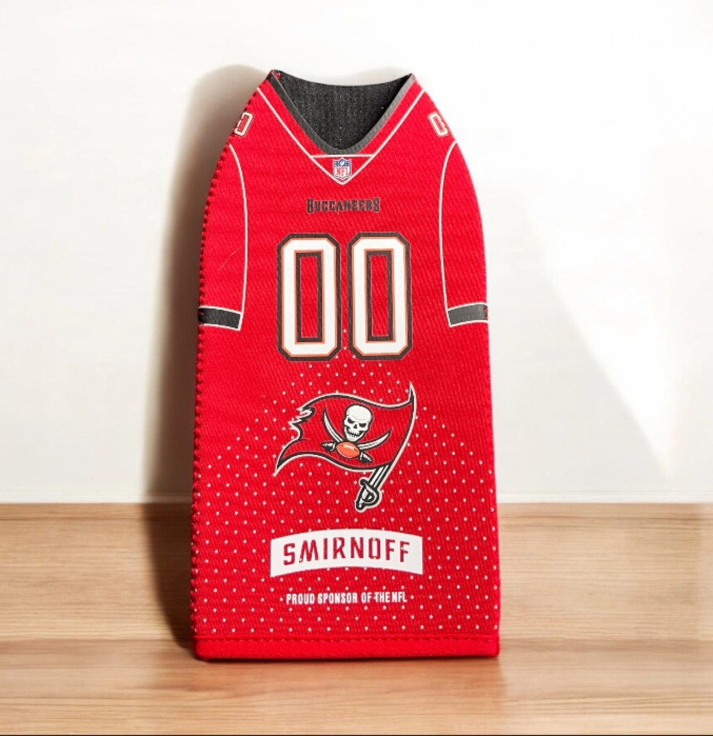 NEW Smirnoff x NFL promotion Tampa Bay Buccaneers bottle cover cozy cooler coozie. Slips over the top of the bottle to keep cold while you celebrate and watch the big game. Measures approximately 8.25" H X 4.25" W Displayed over a wine bottle (see pictures), but would work on most liquor bottles. Show your love for the NFL & TB Buccaneers. Makes a great stocking stuffer at Christmas or treat your dad for Father's Day or Birthday. I ship using recycled material within my home to reduce waste. The package will be wrapped with care if requested or deliver for a fee