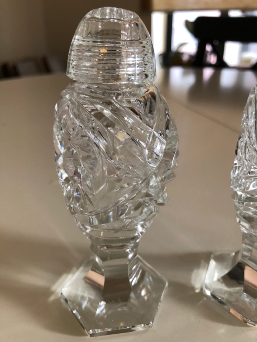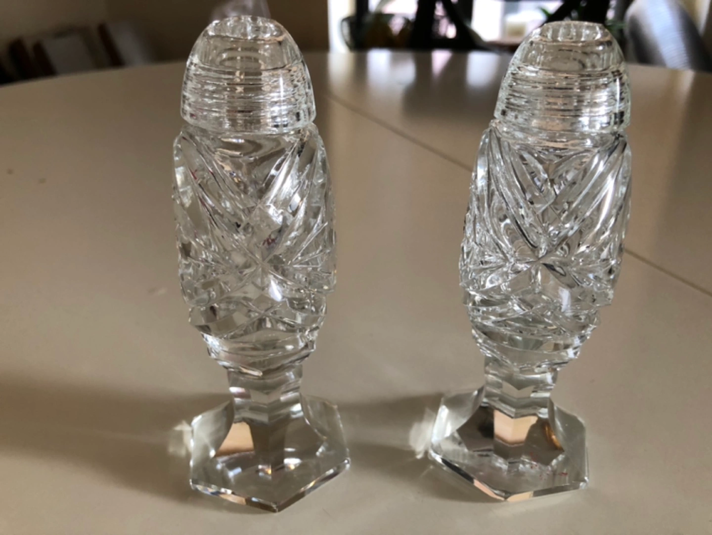 Set of two crystal salt and pepper shakers. Cut glass design.