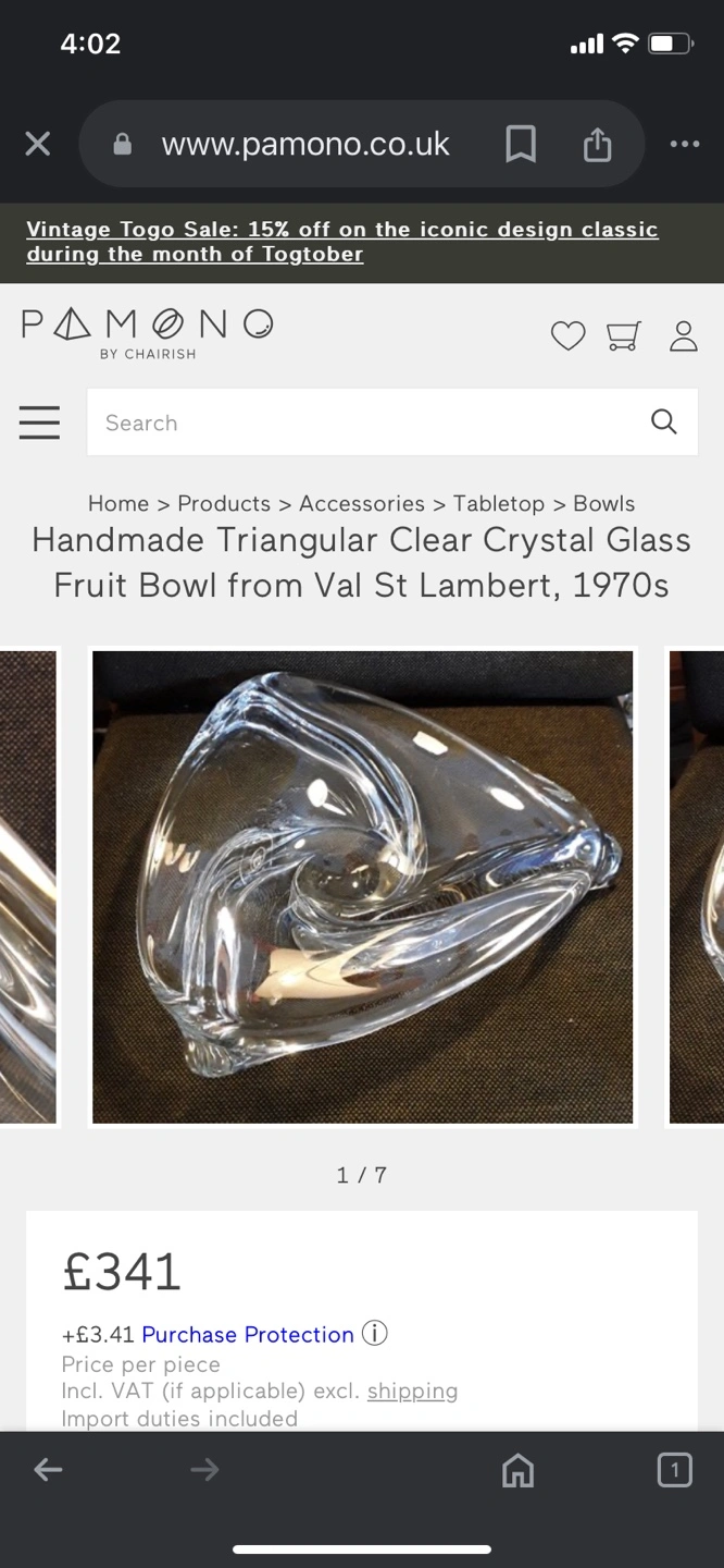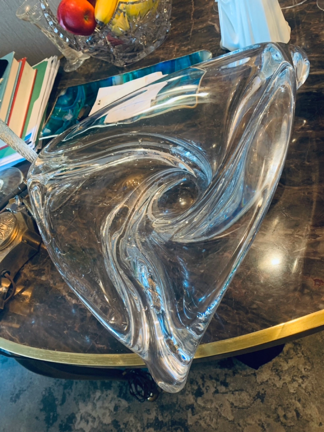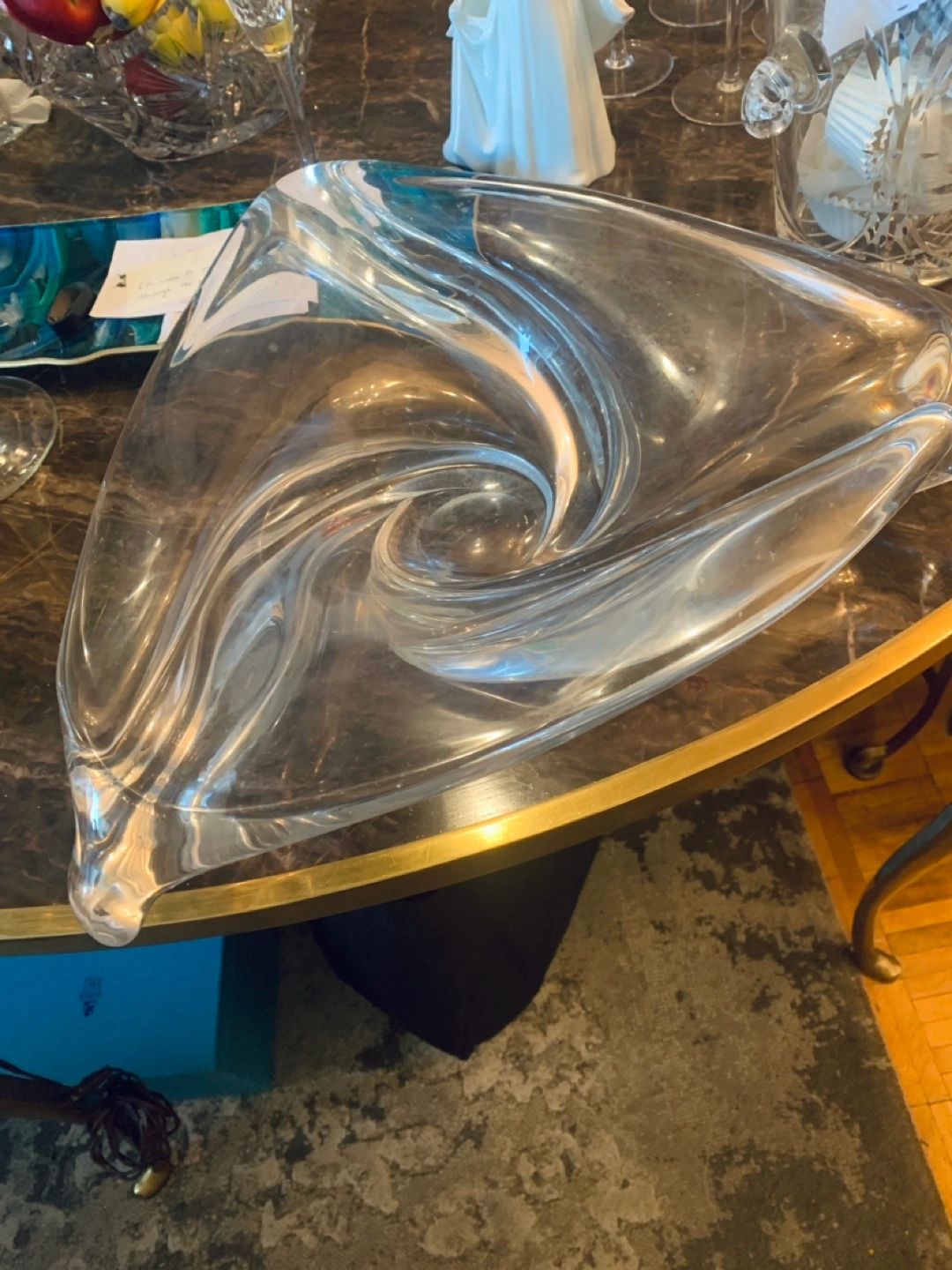 Handmade triangular clear crystal glass fruit bowl. 1970s. Very heavy !!!! Hand made.. With clear signature. Stunning design dish, as a chic statement in hall to hold keys.. or on a coffee table ( as art) Slight Nick on underside.. not visible Pick up only .. thanks! 38/9 height