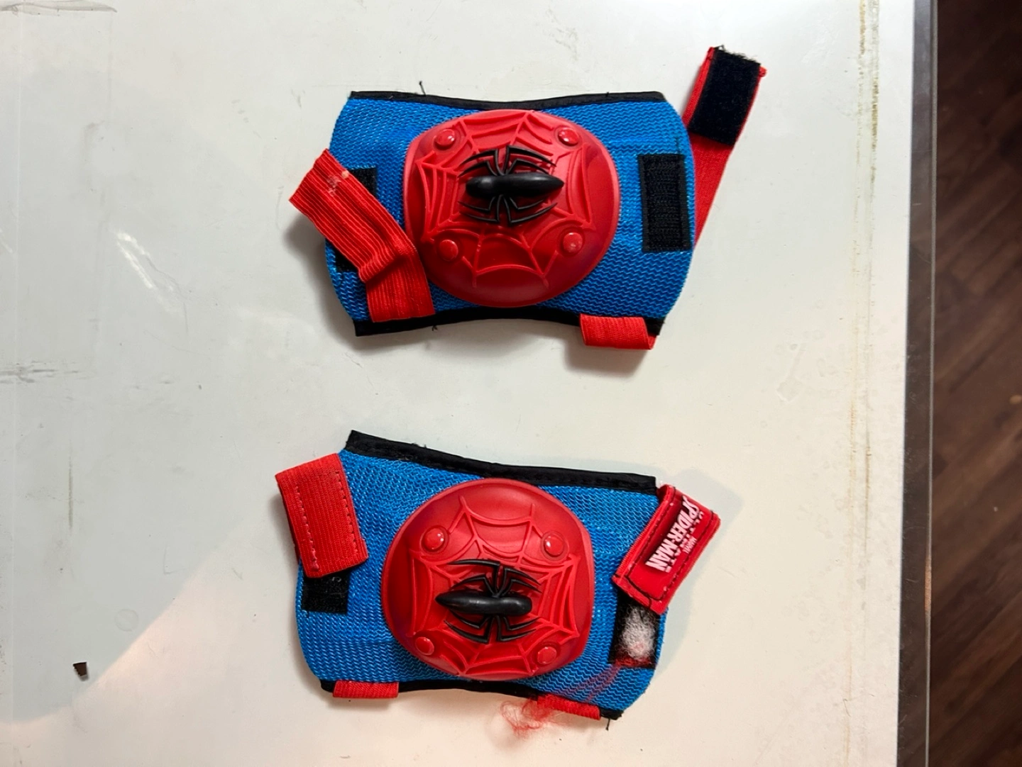 Pair of Spiderman knee pads. Red and blue with a spider emblem. Adjustable straps.