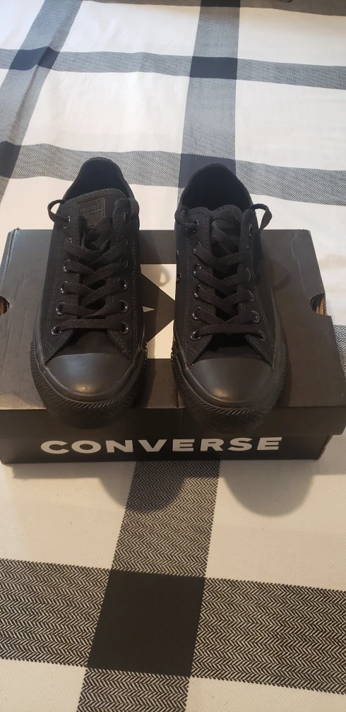 Black low-top sneakers. Size 8 women's, 6 men's. Like new.