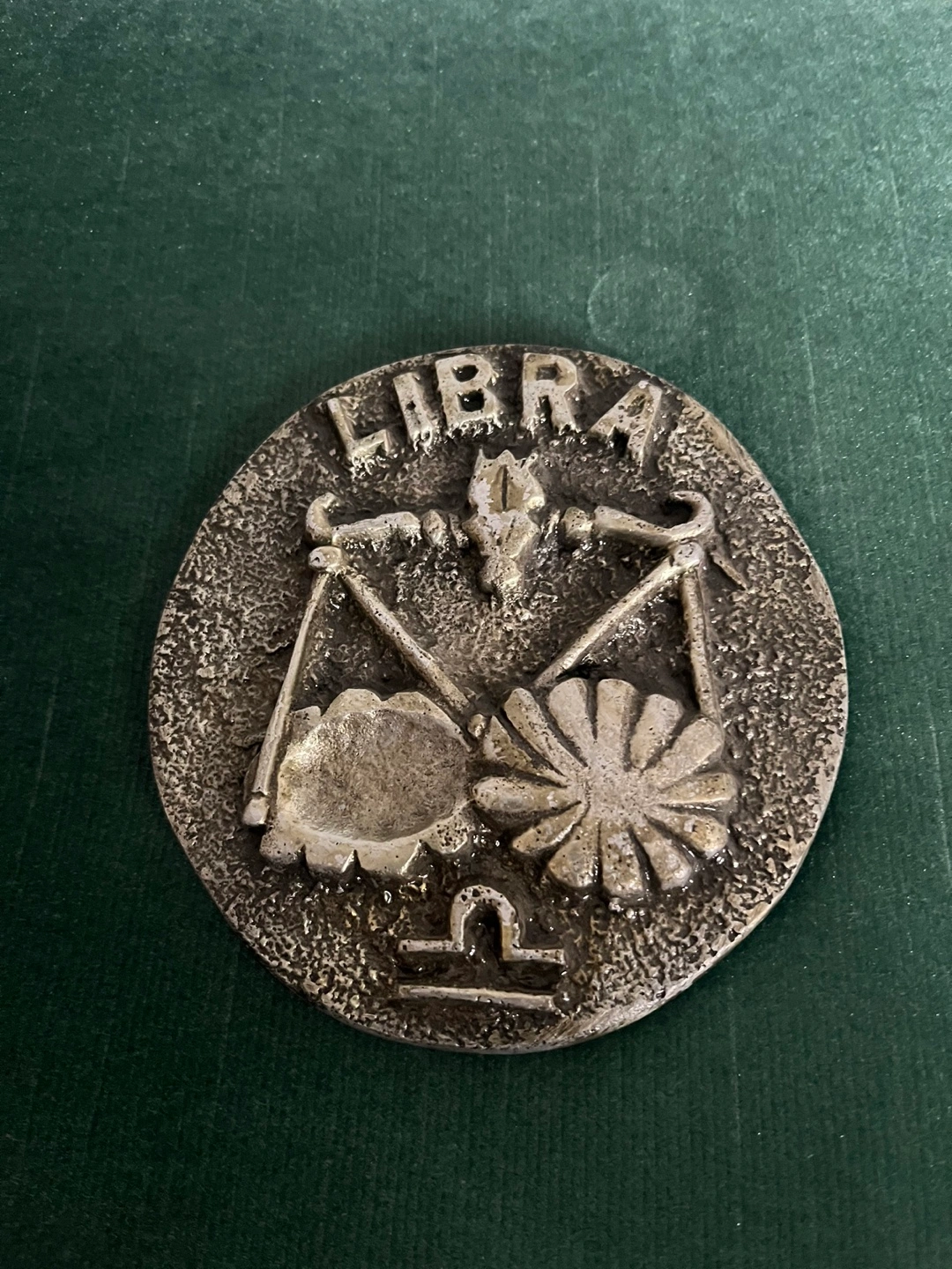 Metal wall decor featuring the Libra zodiac sign. Comes with a hanging hole on the back.