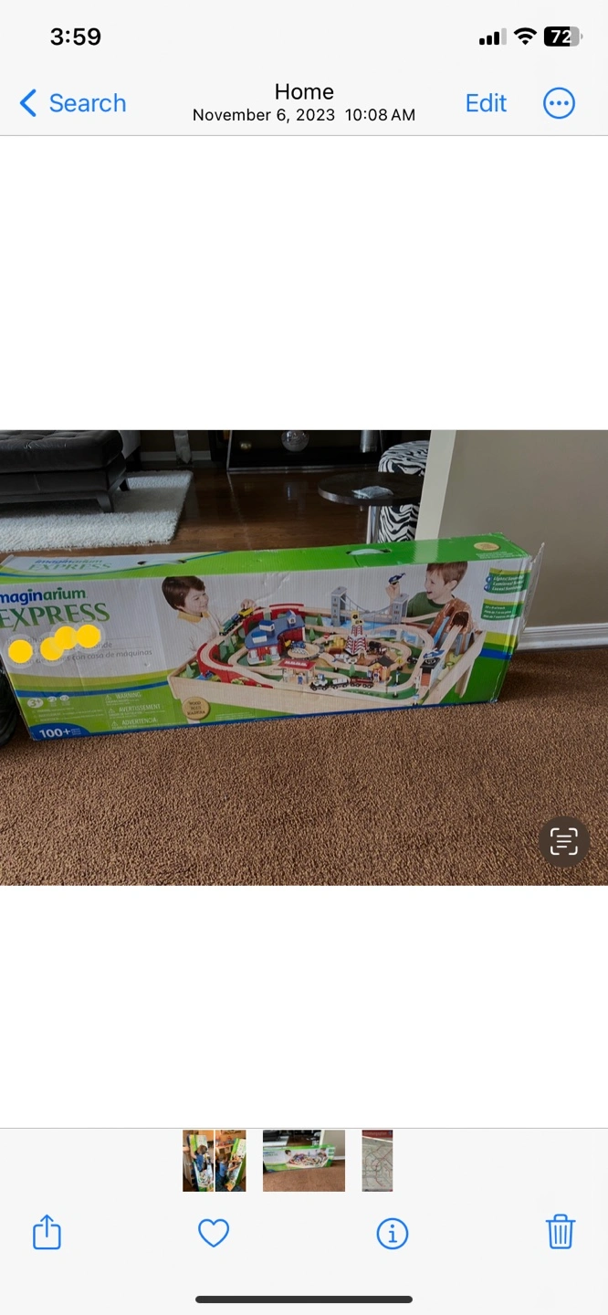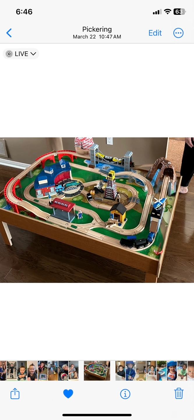 Large wooden train set with table and tracks. Includes a variety of trains, cars Hardly used at Grama’s house