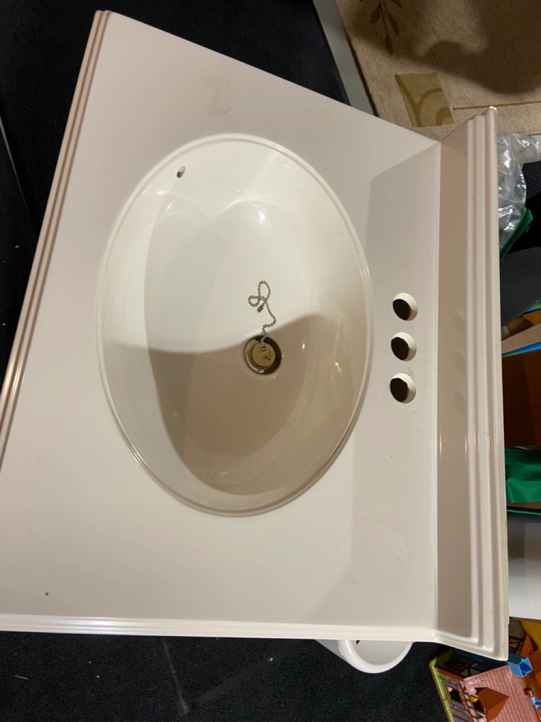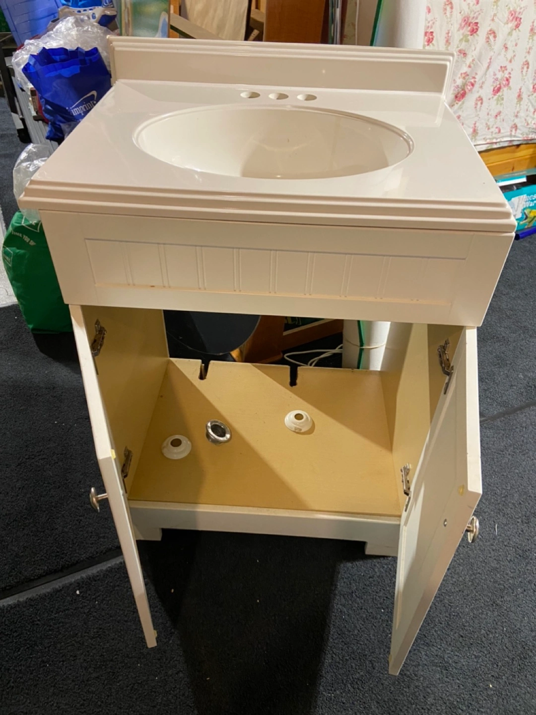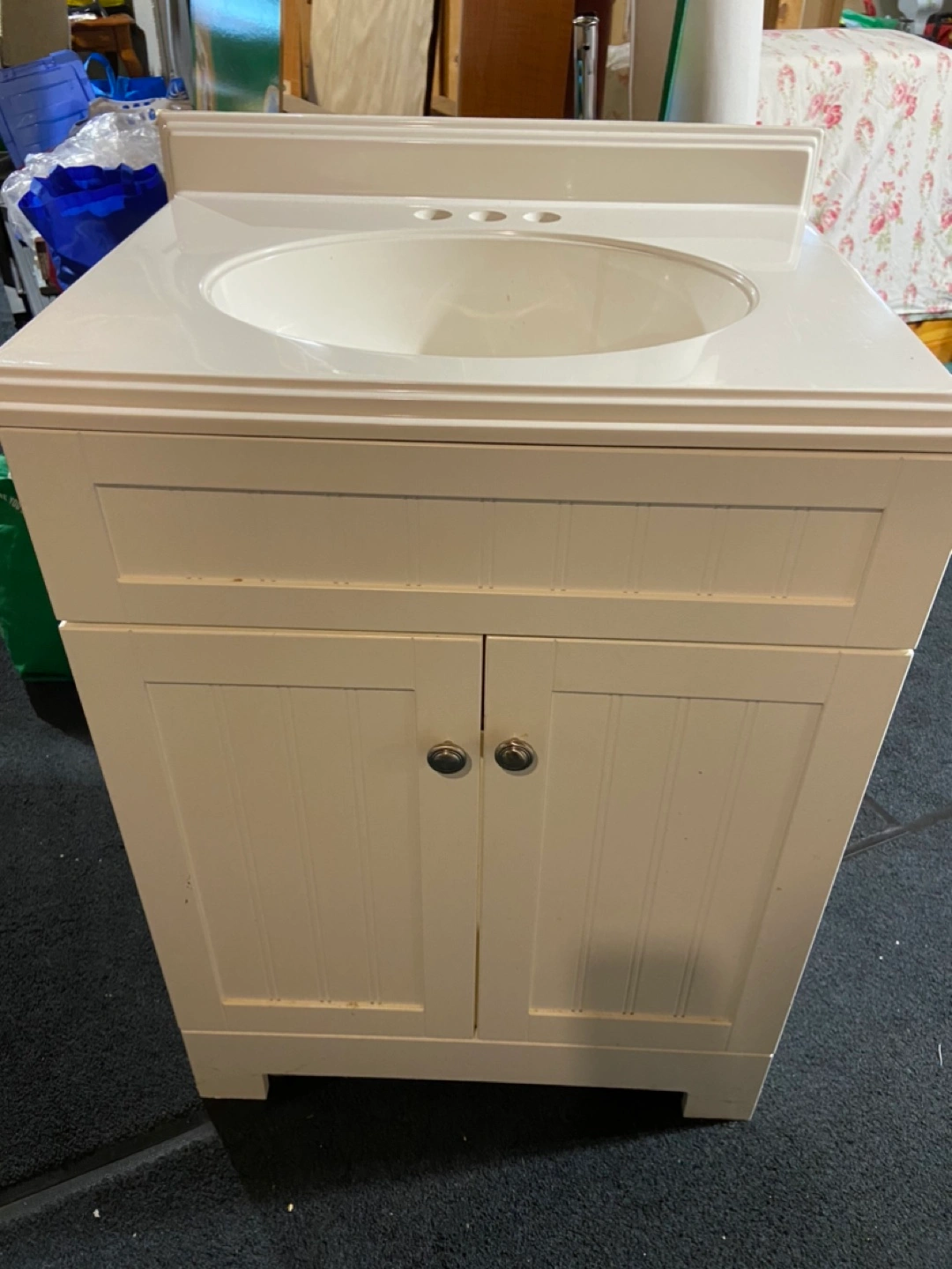 White vanity with a single sink and one drawer and two doors. Includes countertop and sink. Sink top counter 25 1/4” wide, 19” long, 1 1/2”high, backsplash 4” Unit is 18” long from wall to front of cabinet, 24” wide, 32” height