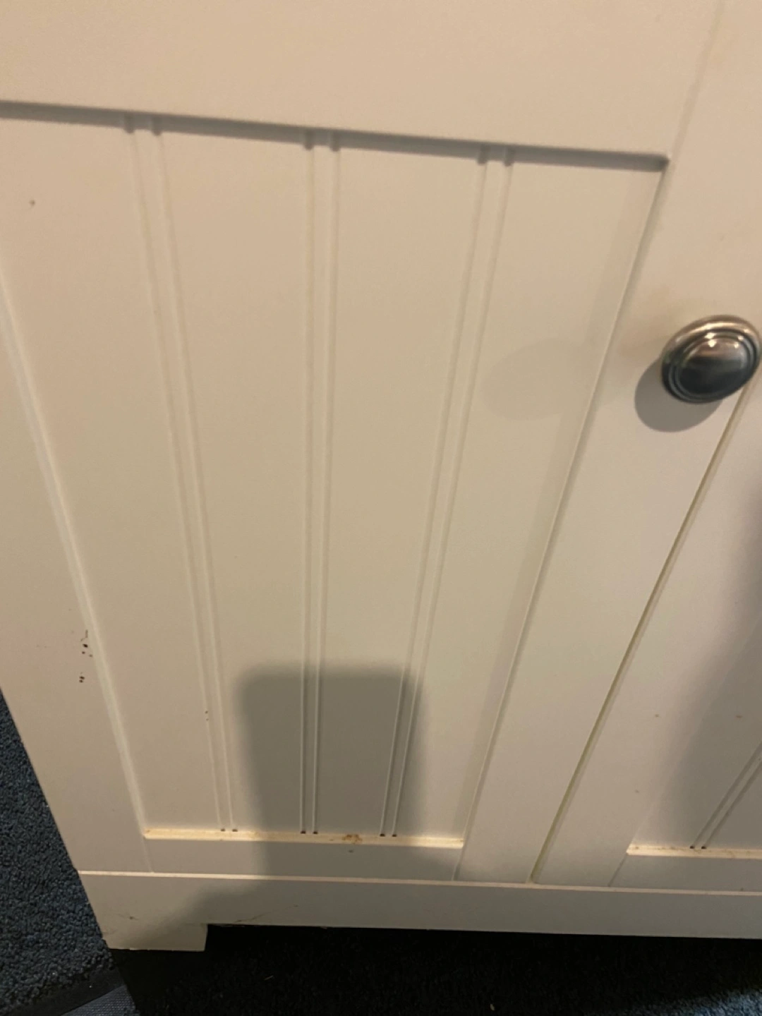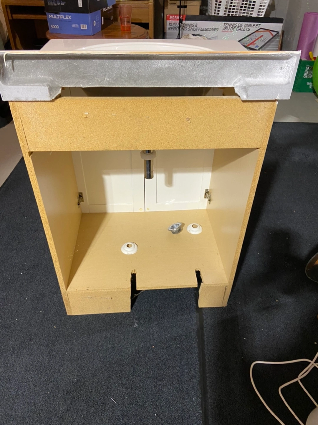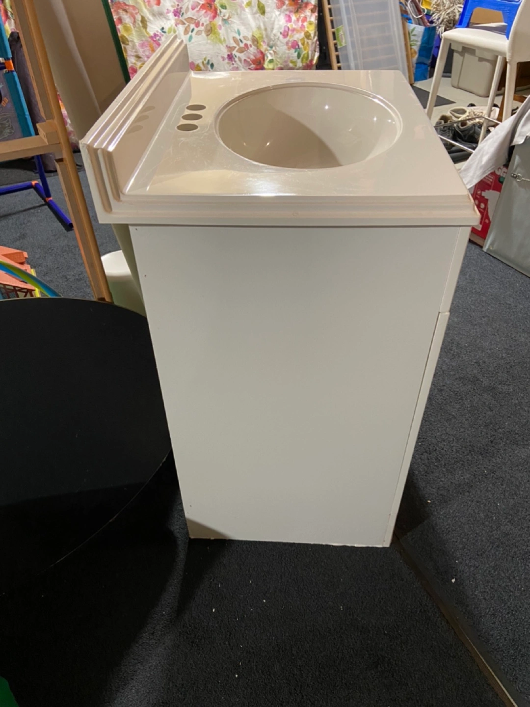 White vanity with a single sink and one drawer and two doors. Includes countertop and sink. Sink top counter 25 1/4” wide, 19” long, 1 1/2”high, backsplash 4” Unit is 18” long from wall to front of cabinet, 24” wide, 32” height