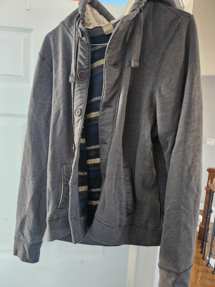 Grey button up hoodie with a fleece lined hood. The hoodie has two pockets on the front. new super warm