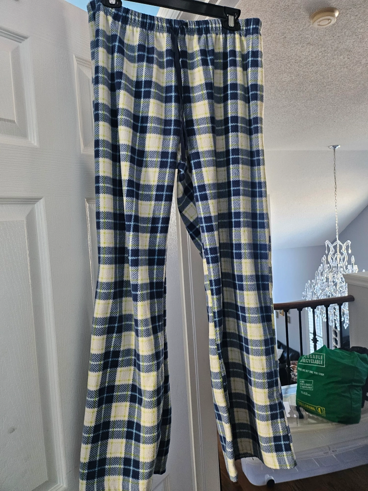 Blue and white plaid pajama pants. Drawstring waistband. super warm and comfy