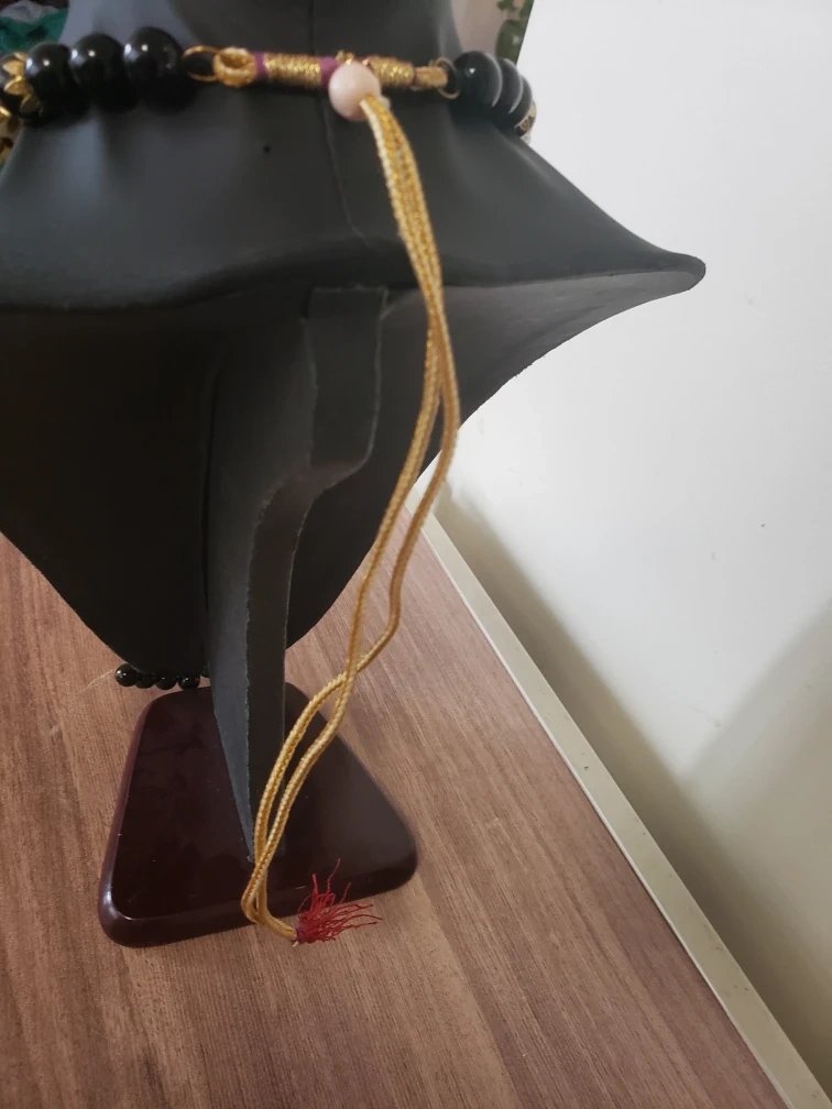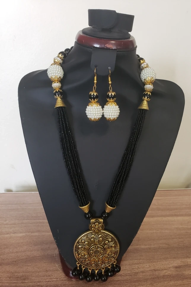 Beautiful black and white beaded necklace with a large gold pendant and matching earrings.